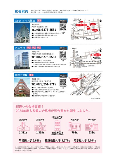 N天王寺校●大阪教育大学附属天王寺校舎至なかもず地下鉄御堂筋線近鉄南大阪線ファミリーマート●近鉄大阪阿部野橋駅●あべのハルカス近鉄本店●HOOPロッテリア●北口JR天王寺駅Mio●天王寺駅地下鉄16号出口7号出口地下鉄谷町線至東梅田至梅田〒543-0054大阪市天王寺区南河堀町3-23TEL(06)6776-0581●JR天王寺駅北口から徒歩5分●地下鉄御堂筋線・谷町線天王寺駅7号出口(御堂筋線)16号出口(谷町線)から徒歩6分●近鉄南大阪線大阪阿部野橋駅から徒歩8分HP天王寺校至新大阪1号出口公園N地下鉄中津駅東大・京大・医進館セルスタ新御堂筋公園大阪校ハートンホテル北梅田ファミリーマート4号出口阪急電鉄至大阪梅田ホテル阪急インターナショナルMBS梅田ロフト地下鉄御堂筋線至十三至梅田大阪北キャンパス大阪校中3動画で校舎を見学!〒531-0072大阪市北区豊崎3-13-1TEL(06)6375-8581●地下鉄御堂筋線中津駅4号出口から徒歩2分●阪急大阪梅田駅茶屋町口から徒歩6分●JR大阪駅から徒歩11分大阪校HP天王寺校中1中2中3動画で校舎を見学!校舎案内お申し込みに関するお問い合わせは、各校舎にて随時承っております。お気軽にお電話ください。受付時間11:30〜19:30日曜・祝日は11:30〜17:00)神戸三宮校中3動画で校舎を見学!ローソン●N〒651-0094神戸市中央区琴ノ緒町5-7-1TEL(078)251-1715神戸三宮校●JR三ノ宮駅中央口から徒歩3分●地下鉄山手線三宮駅東出口2から徒歩3分●阪急神戸線神戸三宮駅・ポートライナー三宮駅から徒歩3分●阪神本線神戸三宮駅から徒歩3分HP田梅阪阪大大線至線至戸戸神神急ファミリーマート阪●JR神戸三宮校●セブンイレブン北野坂マクドナルド●●なか卯手線地鉄下山鉄下地駅宮神急三阪駅宮三戸三宮オーパ2●駅JR宮ノ三ポートライナー三宮駅●ミント神戸阪神神戸三宮駅※(学)河合塾主催桁違いの合格実績!2024年度も多数の合格者が河合塾から誕生しました。東京大学京都大学国公立大学医学部医学科大阪大学神戸大学1,311名1,318名合計1,603名防衛医科大学校を含む703名632名早稲田大学5,638名慶應義塾大学3,577名同志社大学5,764名この合格実績は、2024年度入試における河合塾グループ関連法人の生徒の合格状況についてまとめたものです。各大学の合格者数は、河合塾グループ関連法人の在籍者および講習受講生の集計であり、公開模試のみの受験生は含まれていません。ただし一人で複数の大学・学部・学科に合格した場合は、それぞれに合格者として計上しています。