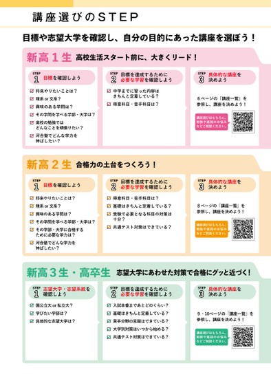 講座選びのSTEP目標や志望大学を確認し、自分の目的にあった講座を選ぼう!新高1生高校生活スタート前に、大きくリード!1STEP目標を確認しよう将来やりたいことは?理系or文系?興味のある学問は?その学問を学べる学部・大学は?高校の勉強ではどんなことを頑張りたい?河合塾でどんな学力を伸ばしたい?2STEP目標を達成するために必要な学習を確認しよう3STEP具体的な講座を決めよう中学までに習った内容はきちんと定着している?得意科目・苦手科目は?6ページの「講座一覧」を参照し、講座を決めよう!講座選びはもちろん、勉強や進路のお悩みなどご相談ください。新高2生合格力の土台をつくろう!1STEP目標を確認しよう将来やりたいことは?理系or文系?興味のある学問は?その学問を学べる学部・大学は?その学部・大学に合格するために必要な学力は?河合塾でどんな学力を伸ばしたい?2STEP目標を達成するために必要な学習を確認しよう得意科目・苦手科目は?基礎はきちんと定着している?受験で必要となる科目の対策は十分?共通テスト対策はできている?3STEP具体的な講座を決めよう8ページの「講座一覧」を参照し、講座を決めよう!講座選びはもちろん、勉強や進路のお悩みなどご相談ください。新高3生・高卒生志望大学にあわせた対策で合格にグッと近づく!1STEP志望大学・志望系統を確認しよう2STEP目標を達成するために必要な学習を確認しよう3STEP具体的な講座を決めよう国公立大or私立大?学びたい学部は?具体的な志望大学は?入試本番まであとどのくらい?基礎はきちんと定着している?苦手分野の克服はできている?大学別対策はいつから始める?共通テスト対策はできている?9・10ページの「講座一覧」を参照し、講座を決めよう!講座選びはもちろん、勉強や進路のお悩みなどご相談ください。