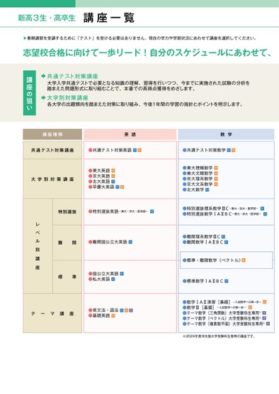 新高3生・高卒生講座一覧▶春期講習を受講するために「テスト」を受ける必要はありません。現在の学力や学習状況にあわせて講座を選択してください。志望校合格に向けて一歩リード!自分のスケジュールにあわせて、共通テスト対策講座大学入学共通テストで必要となる知識の理解、習得を行いつつ、今までに実施された試験の分析を踏まえた問題形式に取り組むことで、本番での高得点獲得をめざします。大学別対策講座各大学の出題傾向を踏まえた対策に取り組み、今後1年間の学習の指針とポイントを明示します。講座の狙い講座種類英語数学共通テスト対策講座●共通テスト対策英語対映●共通テスト対策数学対映映映映映●東大理類数学●東大文類数学●京大理系数学●京大文系数学●北大数学対対映映映対●東大英語●京大英語●北大英語●早慶大英語大学別対策講座●特別選抜理系数学ⅢC-東大・京大・医学部-●特別選抜数学ⅠAⅡBC-東大・京大・医学部-対対オ映オオ●数学ⅠAⅡ演習[基礎]-入試数学への第一歩-●数学Ⅲ[基礎]-入試数学への第一歩-●テーマ数学(三角関数)大学受験科生専用※●テーマ数学(ベクトル)大学受験科生専用※●テーマ数学(複素数平面)大学受験科生専用※映※2024年度河合塾大学受験科生専用の講座です。●難関理系数学ⅢC●難関数学ⅠAⅡBC対対●標準・難関数学(ベクトル)映●標準数学ⅠAⅡBC対特別選抜●特別選抜英語-東大・京大・医学部-対レベル別講座難関●難関国公立大英語対標準●国公立大英語●私大英語対対テーマ講座●英文法・語法●基礎英語映対映オ