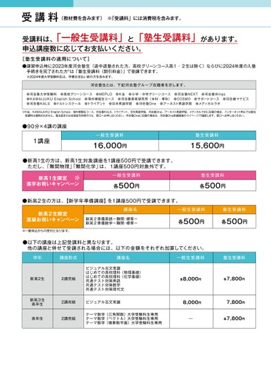 受講料(教材費を含みます)※「受講料」には消費税を含みます。受講料は、「一般生受講料」と「塾生受講料」があります。申込講座数に応じてお支払いください。[塾生受講料の適用について]●講習申込時に2023年度河合塾生(途中退塾された方、高校グリーンコース高1・2生は除く)ならびに2024年度の入塾手続きを完了された方※は「塾生受講料(割引料金)」で受講できます。※2024年度大学受験科生は、学費お支払い前の方を含みます。河合塾生とは、下記河合塾グループ在籍者を示します。●河合塾大学受験科●高校グリーンコース●MEPLO●K会●小学・中学グリーンコース●河合塾NEXT●河合塾Winɡs●KAWAIJUKUEnɡlishSchool●海外帰国生コース●河合塾美術研究所(本科・専科)●COSMO●サポートコース●河合塾マナビス●河合塾KALS●ドルトンスクール●トライデント●日米英語学院●河合塾One●アーネスト英語学院●メディカルラボ※K会、KAWAIJUKUEnɡlishSchool、海外帰国生コース、河合塾KALS、トライデント、日米英語学院、河合塾One、アーネスト英語学院、メディカルラボに在籍の場合、インターネット申込では塾生受講料は適用されません。塾生証または会員証を持参のうえ、窓口へお申し出ください。河合塾Oneに在籍の場合は、河合塾One受講画面のマイページで確認します。窓口へお申し出ください。●90分×4講の講座1講座一般生受講料16,000円●新高1生の方は、新高1生対象講座を1講座500円で受講できます。ただし、「難関物理」「難関化学」は、1講座500円対象外です。新高1生限定進学お祝いキャンペーン一般生受講料各500円●新高2生の方は、【新学年準備講座】を1講座500円で受講できます。塾生受講料15,600円塾生受講料各500円新高2生限定進級お祝いキャンペーン※一般申込からの受付となります。講座名新高2準備英語-難関・標準-新高2準備数学-難関・標準-一般生受講料各500円塾生受講料各500円●以下の講座は上記受講料と異なります。他の講座と併せて受講される場合には、以下の金額をそれぞれ加算してください。学年講座形式講座名一般生受講料塾生受講料新高2生2講完結ビジュアル古文常識はじめての高校理科(物理基礎)はじめての高校理科(化学基礎)共通テスト対策英語共通テスト対策数学共通テスト対策現代文各8,000円各7,800円新高3生高卒生2講完結ビジュアル古文常識高卒生2講完結テーマ数学(三角関数)大学受験科生専用テーマ数学(ベクトル)大学受験科生専用テーマ数学(複素数平面)大学受験科生専用8,000円7,800円ー各7,800円