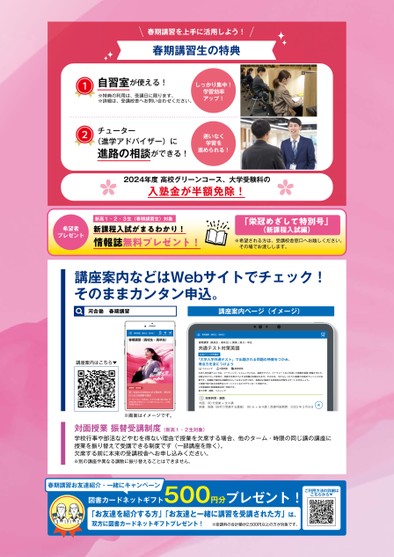春期講習を上手に活用しよう!春期講習生の特典自習室が使える!※特典の利用は、受講日に限ります。※詳細は、受講校舎へお問い合わせください。しっかり集中!学習効率アップ!チューター(進学アドバイザー)に進路の相談ができる!迷いなく学習を進められる!122024年度高校グリーンコース、大学受験科の入塾金が半額免除!希望者プレゼント新高1・2・3生(春期講習生)対象新課程入試がまるわかり!情報誌無料プレゼント!「栄冠めざして特別号」(新課程入試編)※希望される方は、受講校舎窓口へお越しください。その場でお渡しします。講座案内などはWebサイトでチェック!そのままカンタン申込。河合塾春期講習講座案内ページ(イメージ)春期講習(高校生・高卒生)ログインお気に入りカート春期講習(高校生・高卒生)春期講習(高校生・高卒生)春期講習(高校生・高卒生)|関東|高3・卒生共通テスト対策英語共通テスト対策講座講座案内はこちら▼「大学入学共通テスト」で出題される問題の特徴をつかみ、得点力を身につけようリスニング対面授業映像授業高校生・高卒生第一志望大学合格をめざす高校生・高卒生のための短期集中講座今、知っておくべき要点を、わずか4日間で集中攻略。新学期以降の学習をスムーズに進められるように、この春、河合塾で始めよう!※画面はイメージです。大学入学共通テストでは、リーディング、リスニングともに、図表やグラフ、ワークシートなどを用いて情報を整理・把握させたり、比較させたりして思考力・判断力を測ろうとする問題が出題されます。そのため、今からしっかりと基礎力を固めていくことが必要です。本講座で独特な出題形式とレベルをいち早く知り、高得点に直結する効率的な学習をスタートさせましょう。*授業で扱う英文の音声はスマートフォンなどでダウンロード可能です。*対面授業と映像授業は同一内容です。扱う分野:読解、リスニング授業時間・講数対面90分授業全4講映像映像(自宅で受講する講座)90分全4講|受講可能期間:2023年3月8日対面授業振替受講制度(新高1・2生対象)学校行事や部活などやむを得ない理由で授業を欠席する場合、他のターム・時限の同じ講の講座に授業を振り替えて受講できる制度です(一部講座を除く)。欠席する前に本来の受講校舎へお申し込みください。※別の講座や異なる講数に振り替えることはできません。春期講習お友達紹介・一緒にキャンペーン図書カードネットギフト500円分プレゼント!ご利用方法の詳細はこちらから▶「お友達を紹介する方」「お友達と一緒に講習を受講された方」は、双方に図書カードネットギフトプレゼント!※受講料の合計額が2,500円以上の方が対象です。