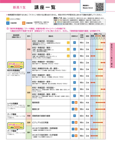 新高1生講座一覧講座案内・申込はこちら▶▶春期講習を受講するために「テスト」を受ける必要はありません。現在の学力や学習状況にあわせて講座を選択してください。リスニングあり対対面授業映映像授業*映像授業の申込・受講方法は15ページをご覧ください。基礎講座レベル講座レベルの目安です。数字が大きいほど、難易度の高い授業を行います。発展高度な学力(論理的思考力、課題解決力、論述力等)を伸ばします。知識を活用するための応用力、思考力・判断力・表現力を伸ばします。基本知識の理解と、それに基づき考察する力、問題を解く力を伸ばします。531642「新学年準備講座」「テーマ講座」が進学お祝いキャンペーンの対象です。1講座500円で受講できます(詳細は5ページをご覧ください)。ただし、「受験英語の基礎の基礎」は対象外です。講座レベル講座種類(講座の狙い)教科講座名授業形式授業時間講数基礎12発展5634進学お祝いキャンペーン/新高1生講座一覧対対対対対対対対対90分2講90分2講90分2講90分2講90分2講90分2講90分2講90分2講90分2講対映90分4講対映90分4講対60分8講対映90分2講対映90分2講1講座円500新学年準備講座これまでの学習内容を振り返るとともに、高校の学習につながる重点テーマを扱う講座です。新高1準備英語-特別選抜-「論理的思考力」を学ぶ!⇒「論理的思考力」がわかる!(難関問題にチャレンジ)英語新高1準備英語-難関-「読解(英文構造と内容の理解)」と「作文(頻出表現の確認)」新高1準備英語-標準-「読解(様々な設問形式へのアプローチ)」と「英文法(中学レベルからの確認)」新高1準備数学-特別選抜-高校で差がつく「場合の数」がわかる!できる!数学国語新高1準備数学中高一貫-難関-高校で差がつく「2次関数・図形と計量」がわかる!できる!新高1準備数学-難関-高校で差がつく「数と式・2次関数」がわかる!できる!新高1準備数学-標準-高校で差がつく「因数分解・数と式の計算」がわかる!できる!新高1準備国語-特別選抜-高校で差がつく「評論文読解(現代文)」「語意・語法(古文)」がわかる!できる!新高1準備国語-難関・標準-高校で差がつく「評論文読解(現代文)」「係り結び・活用形(古文)」がわかる!できる!レベル別講座現役合格に向けて、この春に学力をレベルアップさせたい方を対象とした講座です。理科難関物理難関化学テーマ講座特定のテーマ・分野について学習する講座です。英語受験英語の基礎の基礎国語ビジュアル古文常識1講座円500テーマ講座特定のテーマ・分野について学習する講座です。理科はじめての高校理科(物理基礎)-超重要!数学理解から力学入門-はじめての高校理科(化学基礎)-超重要!モルの理解から始めよう-対映90分2講