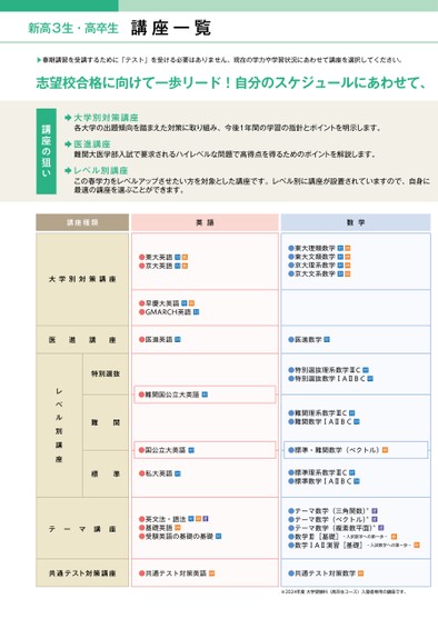 新高3生・高卒生講座一覧▶春期講習を受講するために「テスト」を受ける必要はありません。現在の学力や学習状況にあわせて講座を選択してください。志望校合格に向けて一歩リード!自分のスケジュールにあわせて、大学別対策講座各大学の出題傾向を踏まえた対策に取り組み、今後1年間の学習の指針とポイントを明示します。医進講座難関大医学部入試で要求されるハイレベルな問題で高得点を得るためのポイントを解説します。レベル別講座この春学力をレベルアップさせたい方を対象とした講座です。レベル別に講座が設置されていますので、自身に最適の講座を選ぶことができます。講座の狙い講座種類英語数学●東大英語●京大英語対対映映大学別対策講座●東大理類数学●東大文類数学●京大理系数学●京大文系数学対対対対映映映映●早慶大英語映●GMARCH英語対対医進講座●医進英語対●医進数学対特別選抜難関レベル別講座●特別選抜理系数学ⅢC●特別選抜数学ⅠAⅡBC対対●難関国公立大英語対●難関理系数学ⅢC●難関数学ⅠAⅡBC対対●国公立大英語対●標準・難関数学(ベクトル)映映オ映オオ●テーマ数学(三角関数)※●テーマ数学(ベクトル)※●テーマ数学(複素数平面)※●数学Ⅲ[基礎]-入試数学への第一歩-●数学ⅠAⅡ演習[基礎]-入試数学への第一歩-対対●英文法・語法●基礎英語●受験英語の基礎の基礎映映オテーマ講座共通テスト対策講座●共通テスト対策英語映●共通テスト対策数学映※2024年度大学受験科(高卒生コース)入塾者専用の講座です。標準●私大英語対●標準理系数学ⅢC●標準数学ⅠAⅡBC対対
