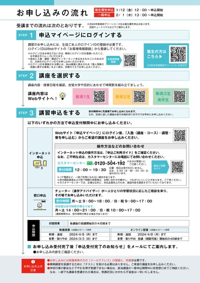 お申し込みの流れ塾生優先申込一般申込1/12(金)12:00〜申込開始2/1(木)13:00〜申込開始受講までの流れは次のとおりです。※2024年度高校グリーンコース生は塾生優先申込があります。別途チュートリアルなどでご案内します。STEP1申込マイページにログインする講習のお申し込みには、生徒ご本人のログインⅠDの登録が必要です。ログインⅠDはWebサイトの「お客様情報登録」から登録してください。※ログインⅠDをお持ちでない方は、事前にログインⅠDを登録いただくと、お手続きがスムーズに行えます。※過去に入塾・講習・模試のインターネット申込をされたことのある方は、お持ちのログインⅠDでお申し込みいただけます。※ログインⅠDを登録される際には、Web画面に表示される「個人情報の保護に関する事項」をよく読み、同意のうえでお申し込みください。お客様情報登録塾生の方はこちら▶※2024年度高校グリーンコース生の方STEP2講座を選択する講座内容・授業日程を確認。志望大学や目的にあわせて時間割を組み立てましょう。講座内容はWebサイトへ!新高1生新高2生新高3生・高卒生STEP3講習申込をする受付期間中に先着順でお申し込みになれます。なお、定員に達した講座は受付を締め切りますのでお早めにお申し込みください。以下のいずれかの方法で申込受付期間中にお申し込みください。Webサイト「申込マイページ」にログイン後、「入塾(講座・コース)・講習・寮を申し込む」からご希望の講座をお申し込みください。操作方法などのお問い合わせ※ⅠP電話など、一部ご利用になれない場合があります。※受付開始直後および終了間際の時間帯は、お問い合わせが集中し、つながりにくいことがあります。ご了承ください。※カスタマーセンターでは、正確な応対と、対応品質向上のため、通話内容を録音させていただいております。チューター(進学アドバイザー)が一人ひとりの学習状況に応じたご相談を承り、その場でお申し込みいただけます。受付時間現役館は受付時間が異なります。月〜土14:00〜21:00/日・祝10:00〜17:00月〜土9:00〜18:00/日・祝9:00〜17:00(講習期間中は、受付時間が異なる場合があります)対面授業各講座の受講開始日の4日前まで映像授業※詳細は15ページ参照新規・追加変更・取りやめ2024/4/8(月)まで2024/3/3(日)までオンライン授業※詳細は15ページ参照新規・追加変更・取りやめ2024/4/8(月)まで受講(視聴可能)開始日の4日前まで窓口申込申込期限■お申し込み受付完了後「申込受付完了のお知らせ」をメールにてご案内します。●お申し込み内容をご確認ください。お申し込み上の注意●お申し込みには保護者等の方の「メールアドレス」の登録と、同意が必要です。●春期講習を受講するために「テスト」を受ける必要はありません。ご希望の講座をお申し込みください。●学校行事の都合などでやむを得ず受講できない場合は、該当講座の一般申込期間中に校舎窓口までご相談ください。なお、一部でも講座を受講された場合は、受講状況にかかわらず返金は一切いたしません。インターネット申込インターネット申込の操作方法は、「申込ご利用ガイド」をご確認ください。なお、ご不明な点は、カスタマーセンターにお電話にてお問い合わせください。カスタマーセンター※おかけ間違いにご注意ください。0120-504-192・・日曜・祝日は受付を行いません。なお、3/20(水・祝)・24(日)は、受付を行います。申込ご利用ガイド受付時間12:00〜19:30