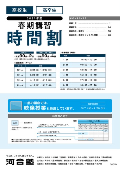 高校生高卒生2024年度春期講習CONTENTS新高1生…………………………………………1新高2生………………………………………新高3生・高卒生……………………………新高3生・高卒生オンライン授業…………143878新高1生1講座90分×2講新高2・3生・高卒生1講座90分×4講※形式(授業分数または講数)の異なる講座もあります。◎設置期間(ターム)ターム1ターム2ターム3ターム4ターム日程3/24(日)〜3/27(水)3/28(木)〜3/31(日)4/2(火)〜4/5(金)・4/6(土)4/7(日)◎授業時間(時限)時限1限2限3限4限5限6限時間9:00〜10:3010:50〜12:2013:20〜14:5015:10〜16:4017:00〜18:3018:50〜20:20※横浜校・水戸校は時間帯が異なります。校舎別時間割をご覧ください。一部の講座では、映像授業も設置しています。視聴可能期間3/7(木)〜4/30(火)山田担当講師名上記の色のマスが授業のある時限です。時間割の見方(例)4/2(火)〜4/5(金)3ターム3413:2014:5015:1016:40この講座は4/2・3の2日間で完結します。授業は3タームの6限です。3タームの1・2限が授業です。3タームの3限が授業です。19:0010:30210:5012:20池田517:0018:30618:5020:20松原4/2・3●同一名称の講座は設置校舎・設置期間(ターム)・授業時間(時限)が異なっても同一内容です。●担当講師は変更になる場合がありますので、あらかじめご了承ください。畑中・阪上・杉井本郷校/麹町校/新宿校/池袋校/秋葉原館/自由が丘校/吉祥寺現役館/調布現役館立川校/町田校/厚木現役館/藤沢館/横浜校/あざみ野現役館/金沢文庫現役館大宮校/南浦和現役館/川越現役館/柏校/津田沼校/千葉現役館/水戸校34010