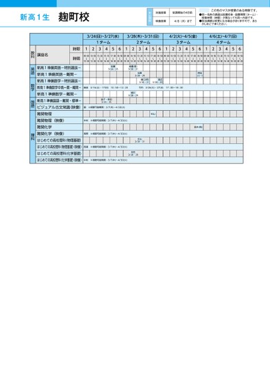この色のマスが授業のある時限です。●同一名称の講座は設置校舎・設置期間(ターム)・かじめご了承ください。授業時間(時限)が異なっても同一内容です。●担当講師は変更になる場合がありますので、あら対面授業受講開始の4日前映像授業4/8(月)まで申込期限新高1生麹町校3/24(日)~3/27(水)3/28(木)~3/31(日)4/2(火)~4/5(金)4/6(土)~4/7(日)1ターム2ターム3ターム4ターム12345612345612345612345609:00〜10:3010:50〜12:2013:20〜14:5015:10〜16:4017:00〜18:3018:50〜20:2009:00〜10:3010:50〜12:2013:20〜14:5015:10〜16:4017:00〜18:3018:50〜20:2009:00〜10:3010:50〜12:2013:20〜14:5015:10〜16:4017:00〜18:3018:50〜20:2009:00〜10:3010:50〜12:2013:20〜14:5015:10〜16:4017:00〜18:3018:50〜20:20佐藤3/24・25髙橋(保)3/30・31松野3/28・29口(哲)3/30・31渡辺3/28・29島田3/16(土)・17(日)10:50〜12:20竹内3/26(火)・27(水)17:00〜18:30杉山横川3/28・29金子・森田3/24・25園※視聴可能期間:3/7(木)〜4/30(火)木村※視聴可能期間:3/7(木)〜4/30(火)青野※視聴可能期間:3/7(木)〜4/30(火)西浦※視聴可能期間:3/7(木)〜4/30(火)中村※視聴可能期間:3/7(木)〜4/30(火)杉山3/30・31寺田3/28・29押田4/2・3鈴木(翔)講座名時限時間新高1準備英語-特別選抜-新高1準備英語-難関-新高1準備数学-特別選抜-新高1準備数学中高一貫-難関-新高1準備数学-難関-新高1準備国語-難関・標準-ビジュアル古文常識(映像)難関物理難関物理(映像)難関化学難関化学(映像)はじめての高校理科(物理基礎)はじめての高校理科(物理基礎)映像)はじめての高校理科(化学基礎)はじめての高校理科(化学基礎)映像)教科英語数学国語理科●2024年度/春期講習/東日本/麹町/高1生/パターン14452024_58_3_328_31_20231201170554.csv/1ページ校了時削除