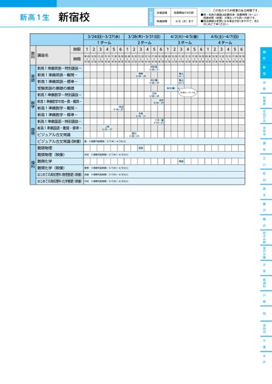 麹町新宿池袋秋葉原自由が丘吉祥寺調布立川町田厚木藤沢横浜あざみ野金沢文庫大宮南浦和川越柏津田沼千葉水戸3/24(日)~3/27(水)3/28(木)~3/31(日)4/2(火)~4/5(金)4/6(土)~4/7(日)1ターム2ターム3ターム4ターム12345612345612345612345609:00〜10:3010:50〜12:2013:20〜14:5015:10〜16:4017:00〜18:3018:50〜20:2009:00〜10:3010:50〜12:2013:20〜14:5015:10〜16:4017:00〜18:3018:50〜20:2009:00〜10:3010:50〜12:2013:20〜14:5015:10〜16:4017:00〜18:3018:50〜20:2009:00〜10:3010:50〜12:2013:20〜14:5015:10〜16:4017:00〜18:3018:50〜20:20高山4/2・3高山4/4・5吉川(量)9:00~11:10木村(哲)3/30・31吉川(量)3/28・29三木3/28・29成合3/28・29三河・園3/30・31岡島青柳3/28・29今田3/26・27永島3/30・31貴川3/28・29宮原上野3/26・27園※視聴可能期間:3/7(木)〜4/30(火)木村※視聴可能期間:3/7(木)〜4/30(火)青野※視聴可能期間:3/7(木)〜4/30(火)西浦※視聴可能期間:3/7(木)〜4/30(火)中村※視聴可能期間:3/7(木)〜4/30(火)講座名時限時間新高1準備英語-特別選抜-新高1準備英語-難関-新高1準備英語-標準-受験英語の基礎の基礎新高1準備数学-特別選抜-新高1準備数学中高一貫-難関-新高1準備数学-難関-新高1準備数学-標準-新高1準備国語-特別選抜-新高1準備国語-難関・標準-ビジュアル古文常識ビジュアル古文常識(映像)難関物理難関物理(映像)難関化学難関化学(映像)はじめての高校理科(物理基礎)映像)はじめての高校理科(化学基礎)映像)教科英語数学国語理科●2024年度/春期講習/東日本/新宿/高1生/パターン14452024_58_3_329_31_20231201170554.csv/1ページ校了時削除この色のマスが授業のある時限です。●同一名称の講座は設置校舎・設置期間(ターム)・かじめご了承ください。授業時間(時限)が異なっても同一内容です。●担当講師は変更になる場合がありますので、あら対面授業受講開始の4日前映像授業4/8(月)まで申込期限新高1生新宿校