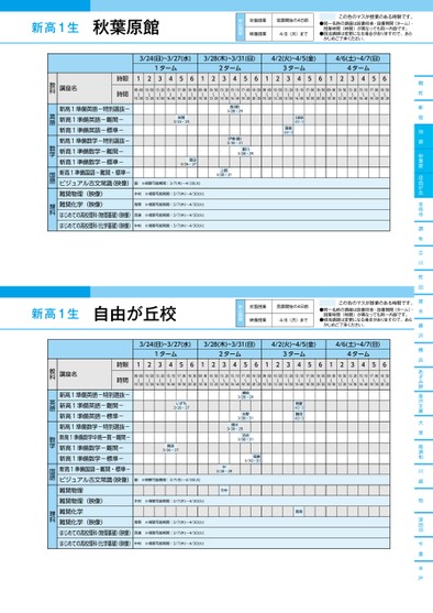 厚木藤沢横浜あざみ野金沢文庫大宮南浦和川越柏津田沼千葉水戸麹町新宿池袋秋葉原自由が丘吉祥寺調布立川町田3/24(日)~3/27(水)3/28(木)~3/31(日)4/2(火)~4/5(金)4/6(土)~4/7(日)1ターム2ターム3ターム4ターム12345612345612345612345609:00〜10:3010:50〜12:2013:20〜14:5015:10〜16:4017:00〜18:3018:50〜20:2009:00〜10:3010:50〜12:2013:20〜14:5015:10〜16:4017:00〜18:3018:50〜20:2009:00〜10:3010:50〜12:2013:20〜14:5015:10〜16:4017:00〜18:3018:50〜20:2009:00〜10:3010:50〜12:2013:20〜14:5015:10〜16:4017:00〜18:3018:50〜20:20岩間3/24・25森(博)3/28・29伊東(鋼)3/30・31夏川3/28・29土岐田4/2・3濱崎4/2・3窪田3/26・27上野3/30・31園※視聴可能期間:3/7(木)〜4/30(火)木村※視聴可能期間:3/7(木)〜4/30(火)青野※視聴可能期間:3/7(木)〜4/30(火)西浦※視聴可能期間:3/7(木)〜4/30(火)中村※視聴可能期間:3/7(木)〜4/30(火)講座名時限時間新高1準備英語-特別選抜-新高1準備英語-難関-新高1準備英語-標準-新高1準備数学-特別選抜-新高1準備数学-難関-新高1準備数学-標準-新高1準備国語-難関・標準-ビジュアル古文常識(映像)難関物理(映像)難関化学(映像)はじめての高校理科(物理基礎)映像)はじめての高校理科(化学基礎)映像)教科英語数学国語理科この色のマスが授業のある時限です。●同一名称の講座は設置校舎・設置期間(ターム)・授業時間(時限)が異なっても同一内容です。●担当講師は変更になる場合がありますので、あらかじめご了承ください。対面授業受講開始の4日前映像授業4/8(月)まで申込期限新高1生秋葉原館対面授業受講開始の4日前映像授業4/8(月)まで申込期限新高1生自由が丘校この色のマスが授業のある時限です。●同一名称の講座は設置校舎・設置期間(ターム)・授業時間(時限)が異なっても同一内容です。●担当講師は変更になる場合がありますので、あらかじめご了承ください。3/24(日)~3/27(水)3/28(木)~3/31(日)4/2(火)~4/5(金)4/6(土)~4/7(日)1ターム2ターム3ターム4ターム12345612345612345612345609:00〜10:3010:50〜12:2013:20〜14:5015:10〜16:4017:00〜18:3018:50〜20:2009:00〜10:3010:50〜12:2013:20〜14:5015:10〜16:4017:00〜18:3018:50〜20:2009:00〜10:3010:50〜12:2013:20〜14:5015:10〜16:4017:00〜18:3018:50〜20:2009:00〜10:3010:50〜12:2013:20〜14:5015:10〜16:4017:00〜18:3018:50〜20:20瀬﨑3/28・29水野3/30・31國分3/28・29古谷3/30・31福島3/30・31中3/28・29竹中いずも3/26・27高田3/26・27園※視聴可能期間:3/7(木)〜4/30(火)木村※視聴可能期間:3/7(木)〜4/30(火)青野※視聴可能期間:3/7(木)〜4/30(火)西浦※視聴可能期間:3/7(木)〜4/30(火)中村※視聴可能期間:3/7(木)〜4/30(火)明慶4/2・3藤田4/2・3西尾講座名時限時間新高1準備英語-特別選抜-新高1準備英語-難関-新高1準備英語-標準-新高1準備数学-特別選抜-新高1準備数学中高一貫-難関-新高1準備数学-難関-新高1準備数学-標準-新高1準備国語-難関・標準-ビジュアル古文常識(映像)難関物理難関物理(映像)難関化学難関化学(映像)はじめての高校理科(物理基礎)映像)はじめての高校理科(化学基礎)映像)教科英語数学国語理科●2024年度/春期講習/東日本/秋葉原/高1生/パターン14452024_58_3_368_31_20231201170554.csv/1ページ校了時削除