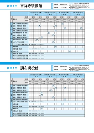 吉祥寺現役館講座名時限時間新高1準備英語-特別選抜-新高1準備英語-難関-新高1準備英語-標準-新高1準備数学-特別選抜-新高1準備数学中高一貫-難関-新高1準備数学-難関-新高1準備数学-標準-新高1準備国語-難関・標準-ビジュアル古文常識ビジュアル古文常識(映像)難関物理難関物理(映像)難関化学難関化学(映像)はじめての高校理科(物理基礎)映像)はじめての高校理科(化学基礎)映像)3/24(日)~3/27(水)3/28(木)~3/31(日)4/2(火)~4/5(金)4/6(土)~4/7(日)1ターム2ターム3ターム4ターム12345612345612345612345609:00〜10:3010:50〜12:2013:20〜14:5015:10〜16:4017:00〜18:3018:50〜20:2009:00〜10:3010:50〜12:2013:20〜14:5015:10〜16:4017:00〜18:3018:50〜20:2009:00〜10:3010:50〜12:20流川3/30・31中島3/28・29相川3/28・29秋山3/28・29貴川3/30・31竹中明慶3/24・25高田3/24・25和田3/24・25園※視聴可能期間:3/7(木)〜4/30(火)木村※視聴可能期間:3/7(木)〜4/30(火)青野※視聴可能期間:3/7(木)〜4/30(火)西浦※視聴可能期間:3/7(木)〜4/30(火)中村※視聴可能期間:3/7(木)〜4/30(火)15:10〜16:4017:00〜18:3018:50〜20:2009:00〜10:3010:50〜12:2013:20〜14:5015:10〜16:4017:00〜18:3018:50〜20:2013:20〜14:50山本4/2・3内山(洋)4/2・3吉田4/6・7宇野沢調布現役館講座名時限時間新高1準備英語-特別選抜-新高1準備英語-難関-新高1準備英語-標準-新高1準備数学中高一貫-難関-新高1準備数学-難関-新高1準備数学-標準-新高1準備国語-難関・標準-ビジュアル古文常識(映像)難関物理難関物理(映像)難関化学難関化学(映像)はじめての高校理科(物理基礎)映像)はじめての高校理科(化学基礎)映像)3/24(日)~3/27(水)3/28(木)~3/31(日)4/2(火)~4/5(金)4/6(土)~4/7(日)1ターム2ターム3ターム4ターム12345612345612345612345609:00〜10:3010:50〜12:2013:20〜14:5015:10〜16:4017:00〜18:3018:50〜20:2009:00〜10:3010:50〜12:2013:20〜14:5015:10〜16:4017:00〜18:3018:50〜20:2009:00〜10:3010:50〜12:2013:20〜14:5015:10〜16:4017:00〜18:3018:50〜20:2009:00〜10:3010:50〜12:2013:20〜14:5015:10〜16:4017:00〜18:3018:50〜20:20中園3/30・31松野3/28・29内山(洋)3/30・31窪田3/30・31高田3/26・27佐藤3/24・25園※視聴可能期間:3/7(木)〜4/30(火)木村※視聴可能期間:3/7(木)〜4/30(火)安東青野※視聴可能期間:3/7(木)〜4/30(火)西浦※視聴可能期間:3/7(木)〜4/30(火)中村※視聴可能期間:3/7(木)〜4/30(火)吉川(量)4/4・5税田4/2・3宇都教科英語数学国語理科教科英語数学国語理科●2024年度/春期講習/東日本/吉祥寺/高1生/パターン14452024_58_3_340_31_20231201170554.csv/1ページ校了時削除
