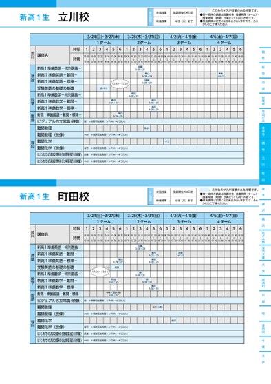 麹町新宿池袋秋葉原自由が丘吉祥寺調布立川町田厚木藤沢横浜あざみ野金沢文庫大宮南浦和川越柏津田沼千葉水戸立川校講座名時限時間新高1準備英語-特別選抜-新高1準備英語-難関-新高1準備英語-標準-受験英語の基礎の基礎新高1準備数学-特別選抜-新高1準備数学-難関-新高1準備数学-標準-新高1準備国語-難関・標準-ビジュアル古文常識(映像)難関物理難関物理(映像)難関化学難関化学(映像)はじめての高校理科(物理基礎)映像)はじめての高校理科(化学基礎)映像)3/24(日)~3/27(水)3/28(木)~3/31(日)4/2(火)~4/5(金)4/6(土)~4/7(日)1ターム2ターム3ターム4ターム12345612345612345612345609:00〜10:3010:50〜12:2013:20〜14:5015:10〜16:4017:00〜18:3018:50〜20:2009:00〜10:3010:50〜12:2013:20〜14:5015:10〜16:4017:00〜18:3018:50〜20:2009:00〜10:3010:50〜12:2013:20〜14:5015:10〜16:4017:00〜18:3018:50〜20:2009:00〜10:3010:50〜12:2013:20〜14:5015:10〜16:4017:00〜18:3018:50〜20:20東内4/6・7中園3/30・31高山3/28・29中園3/28・29相川3/30・31杉山3/30・31古谷3/28・29長谷川小竹13:20~15:30森(千)横川3/26・27和田3/24・25園※視聴可能期間:3/7(木)〜4/30(火)木村※視聴可能期間:3/7(木)〜4/30(火)青野※視聴可能期間:3/7(木)〜4/30(火)西浦※視聴可能期間:3/7(木)〜4/30(火)中村※視聴可能期間:3/7(木)〜4/30(火)町田校講座名時限時間新高1準備英語-特別選抜-新高1準備英語-難関-新高1準備英語-標準-受験英語の基礎の基礎新高1準備数学-特別選抜-新高1準備数学-難関-新高1準備数学-標準-新高1準備国語-難関・標準-ビジュアル古文常識(映像)難関物理難関物理(映像)難関化学難関化学(映像)はじめての高校理科(物理基礎)映像)はじめての高校理科(化学基礎)映像)3/24(日)~3/27(水)3/28(木)~3/31(日)4/2(火)~4/5(金)4/6(土)~4/7(日)1ターム2ターム3ターム4ターム12345612345612345612345609:00〜10:3010:50〜12:2013:20〜14:5015:10〜16:4017:00〜18:3018:50〜20:2009:00〜10:3010:50〜12:2013:20〜14:5015:10〜16:4017:00〜18:3018:50〜20:2009:00〜10:3010:50〜12:2013:20〜14:5015:10〜16:4017:00〜18:3018:50〜20:2009:00〜10:3010:50〜12:2013:20〜14:5015:10〜16:4017:00〜18:3018:50〜20:20近藤4/2・3中島3/28・29東内3/28・29栗原3/28・29堺3/30・31隣3/30・31板谷3/30・31佐々木(哲)安達横田3/26・27近藤17:00~19:10秋山3/24・25中林・酒井(完)3/26・27園※視聴可能期間:3/7(木)〜4/30(火)木村※視聴可能期間:3/7(木)〜4/30(火)青野※視聴可能期間:3/7(木)〜4/30(火)西浦※視聴可能期間:3/7(木)〜4/30(火)中村※視聴可能期間:3/7(木)〜4/30(火)教科英語数学国語理科教科英語数学国語理科●2024年度/春期講習/東日本/立川/高1生/パターン14452024_58_3_315_31_20231201170554.csv/1ページ校了時削除
