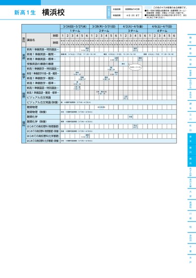 麹町新宿池袋秋葉原自由が丘吉祥寺調布立川町田厚木藤沢横浜あざみ野金沢文庫大宮南浦和川越柏津田沼千葉水戸この色のマスが授業のある時限です。●同一名称の講座は設置校舎・設置期間(ターム)・授業時間(時限)が異なっても同一内容です。●担当講師は変更になる場合がありますので、あらかじめご了承ください。3/24(日)~3/27(水)3/28(木)~3/31(日)4/2(火)~4/5(金)4/6(土)~4/7(日)1ターム2ターム3ターム4ターム12345612345612345612345609:00〜10:3011:00〜12:3013:20〜14:5015:20〜16:5017:20〜18:5019:20〜20:5009:00〜10:3011:00〜12:3013:20〜14:5015:20〜16:5017:20〜18:5019:20〜20:5009:00〜10:3011:00〜12:3013:20〜14:50伊吹3/24・2517:20〜18:5019:20〜20:5009:00〜10:3011:00〜12:3013:20〜14:5015:20〜16:5017:20〜18:5019:20〜20:5015:20〜16:50安井4/2・3髙橋(保)3/16(土)・17(日)17:20〜18:50横田3/30(土)・31(日)15:20〜16:50青柳4/6(土)・7(日)17:20〜18:50この色のマスが授業のある時限です。●同一名称の講座は設置校舎・設置期間(ターム)・授業時間(時限)が異なっても同一内容です。●担当講師は変更になる場合がありますので、あらかじめご了承ください。対面授業受講開始の4日前映像授業4/8(月)まで申込期限新高1生横浜校栗原4/2・3清川9:00~11:10水野3/28・29隣3/28・29塚本3/30・31板谷3/28・29上田4/2・3今枝杉山4/4・5対面授業受講開始の4日前映像授業4/8(月)まで申込期限小林・清水(め)3/28・29佐々木(哲)岩村3/26・27吉崎3/26・27堺3/24・25三河・園3/24・25園※視聴可能期間:3/7(木)〜4/30(火)木村※視聴可能期間:3/7(木)〜4/30(火)青野※視聴可能期間:3/7(木)〜4/30(火)西浦※視聴可能期間:3/7(木)〜4/30(火)浅利3/24・25中村※視聴可能期間:3/7(木)〜4/30(火)講座名時限時間新高1準備英語-特別選抜-新高1準備英語-難関-新高1準備英語-標準-受験英語の基礎の基礎新高1準備数学-特別選抜-新高1準備数学中高一貫-難関-新高1準備数学-難関-新高1準備数学-標準-新高1準備国語-特別選抜-新高1準備国語-難関・標準-ビジュアル古文常識ビジュアル古文常識(映像)難関物理難関物理(映像)難関化学難関化学(映像)はじめての高校理科(物理基礎)はじめての高校理科(物理基礎)映像)はじめての高校理科(化学基礎)はじめての高校理科(化学基礎)映像)教科英語数学国語理科新高1生●2024年度/春期講習/東日本/横浜/高1生/パターン14452024_58_3_321_31_20231201170554.csv/1ページ校了時削除