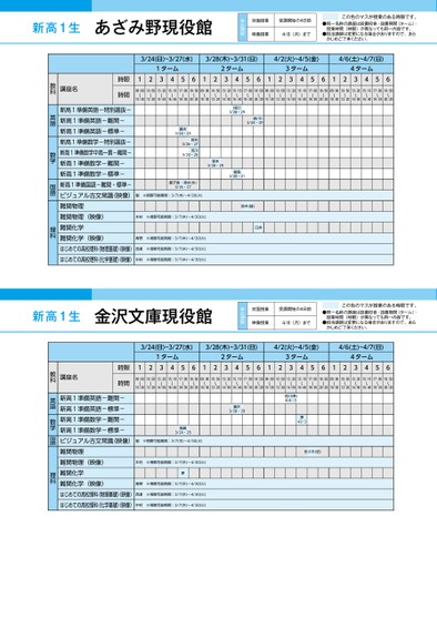 あざみ野現役館講座名時限時間新高1準備英語-特別選抜-新高1準備英語-難関-新高1準備英語-標準-新高1準備数学-特別選抜-新高1準備数学中高一貫-難関-新高1準備数学-難関-新高1準備数学-標準-新高1準備国語-難関・標準-ビジュアル古文常識(映像)難関物理難関物理(映像)難関化学難関化学(映像)はじめての高校理科(物理基礎)映像)はじめての高校理科(化学基礎)映像)3/24(日)~3/27(水)3/28(木)~3/31(日)4/2(火)~4/5(金)4/6(土)~4/7(日)1ターム2ターム3ターム4ターム12345612345612345612345609:00〜10:3010:50〜12:2013:20〜14:5015:10〜16:4017:00〜18:3018:50〜20:2009:00〜10:3010:50〜12:2013:20〜14:5015:10〜16:4017:00〜18:3018:50〜20:2009:00〜10:3010:50〜12:2013:20〜14:5015:10〜16:4017:00〜18:3018:50〜20:2009:00〜10:3010:50〜12:2013:20〜14:5015:10〜16:4017:00〜18:3018:50〜20:20田口3/28・29森(千)3/28・29鏑木3/24・25岩村3/26・27流川3/24・25塚本3/28・29福島3/30・31鹿子島・清水(め)3/26・27園※視聴可能期間:3/7(木)〜4/30(火)木村※視聴可能期間:3/7(木)〜4/30(火)青野※視聴可能期間:3/7(木)〜4/30(火)西浦※視聴可能期間:3/7(木)〜4/30(火)中村※視聴可能期間:3/7(木)〜4/30(火)鈴木(誠)臼井金沢文庫現役館講座名時限時間新高1準備英語-難関-新高1準備英語-標準-新高1準備数学-難関-新高1準備数学-標準-ビジュアル古文常識(映像)難関物理難関物理(映像)難関化学難関化学(映像)はじめての高校理科(物理基礎)映像)はじめての高校理科(化学基礎)映像)3/24(日)~3/27(水)3/28(木)~3/31(日)4/2(火)~4/5(金)4/6(土)~4/7(日)1ターム2ターム3ターム4ターム12345612345612345612345609:00〜10:3010:50〜12:2013:20〜14:5015:10〜16:4017:00〜18:3018:50〜20:2009:00〜10:3010:50〜12:2013:20〜14:5015:10〜16:4017:00〜18:3018:50〜20:2009:00〜10:3010:50〜12:2013:20〜14:5015:10〜16:4017:00〜18:3018:50〜20:2009:00〜10:3010:50〜12:2013:20〜14:5015:10〜16:4017:00〜18:3018:50〜20:20鏑木3/28・29吉川(幸)4/4・5堺4/2・3佐々木(哲)福島3/24・25園※視聴可能期間:3/7(木)〜4/30(火)木村※視聴可能期間:3/7(木)〜4/30(火)原青野※視聴可能期間:3/7(木)〜4/30(火)西浦※視聴可能期間:3/7(木)〜4/30(火)中村※視聴可能期間:3/7(木)〜4/30(火)教科英語数学国語理科教科英語数学国語理科●2024年度/春期講習/東日本/あざみ野/高1生/パターン14452024_58_3_339_31_20231201170554.csv/1ページ校了時削除