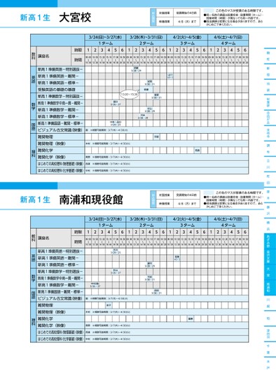 麹町新宿池袋秋葉原自由が丘吉祥寺調布立川町田厚木藤沢横浜あざみ野金沢文庫大宮南浦和川越柏津田沼千葉水戸講座名時限時間新高1準備英語-特別選抜-新高1準備英語-難関-新高1準備英語-標準-受験英語の基礎の基礎新高1準備数学-特別選抜-新高1準備数学中高一貫-難関-新高1準備数学-難関-新高1準備数学-標準-新高1準備国語-難関・標準-ビジュアル古文常識(映像)難関物理難関物理(映像)難関化学難関化学(映像)はじめての高校理科(物理基礎)映像)はじめての高校理科(化学基礎)映像)3/24(日)~3/27(水)3/28(木)~3/31(日)4/2(火)~4/5(金)4/6(土)~4/7(日)1ターム2ターム3ターム4ターム12345612345612345612345609:00〜10:3010:50〜12:2013:20〜14:5015:10〜16:4017:00〜18:3018:50〜20:2009:00〜10:3010:50〜12:2013:20〜14:5015:10〜16:4017:00〜18:3018:50〜20:2009:00〜10:3010:50〜12:2013:20〜14:5015:10〜16:4017:00〜18:3018:50〜20:2009:00〜10:3010:50〜12:2013:20〜14:5015:10〜16:4017:00〜18:3018:50〜20:20明慶3/28・2913:20~15:30山川4/2・3岩間3/30・31明慶秦野3/30・31杉山3/28・29河本3/28・29宇都國分3/26・27中林・品田3/24・25園※視聴可能期間:3/7(木)〜4/30(火)木村※視聴可能期間:3/7(木)〜4/30(火)青野※視聴可能期間:3/7(木)〜4/30(火)西浦※視聴可能期間:3/7(木)〜4/30(火)中村※視聴可能期間:3/7(木)〜4/30(火)岡島南浦和現役館講座名時限時間新高1準備英語-特別選抜-新高1準備英語-難関-新高1準備英語-標準-新高1準備数学-特別選抜-新高1準備数学中高一貫-難関-新高1準備数学-難関-新高1準備国語-難関・標準-ビジュアル古文常識(映像)難関物理難関物理(映像)難関化学難関化学(映像)はじめての高校理科(物理基礎)映像)はじめての高校理科(化学基礎)映像)3/24(日)~3/27(水)3/28(木)~3/31(日)4/2(火)~4/5(金)4/6(土)~4/7(日)1ターム2ターム3ターム4ターム12345612345612345612345609:00〜10:3010:50〜12:2013:20〜14:5015:10〜16:4017:00〜18:3018:50〜20:2009:00〜10:3010:50〜12:2013:20〜14:5015:10〜16:4017:00〜18:3018:50〜20:2009:00〜10:3010:50〜12:2013:20〜14:5015:10〜16:4017:00〜18:3018:50〜20:2009:00〜10:3010:50〜12:2013:20〜14:5015:10〜16:4017:00〜18:3018:50〜20:20石川3/24・25秋山3/26・27中村(隆)3/26・27園※視聴可能期間:3/7(木)〜4/30(火)金子木村※視聴可能期間:3/7(木)〜4/30(火)青野※視聴可能期間:3/7(木)〜4/30(火)西浦※視聴可能期間:3/7(木)〜4/30(火)中村※視聴可能期間:3/7(木)〜4/30(火)加藤4/2・3護守3/28・29今田3/30・31品田3/30・31國兼教科英語数学国語理科教科英語数学国語理科大宮校●2024年度/春期講習/東日本/大宮/高1生/パターン14452024_58_3_324_31_20231201170554.csv/1ページ校了時削除