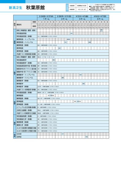 3/24(日)~3/27(水)3/28(木)~3/31(日)4/2(火)~4/5(金)4/6(土)~4/7(日)1ターム2ターム3ターム4ターム12345612345612345612345609:00〜10:3010:50〜12:2013:20〜14:5015:10〜16:4017:00〜18:3018:50〜20:2009:00〜10:3010:50〜12:2013:20〜14:5015:10〜16:4017:00〜18:3018:50〜20:2009:00〜10:3010:50〜12:2013:20〜14:5015:10〜16:4017:00〜18:3018:50〜20:2009:00〜10:3010:50〜12:2013:20〜14:5017:00〜18:3018:50〜20:2015:10〜16:40清川4/6・7田口髙橋(保)村上土岐田渡辺島田野中・酒井(完)小山※視聴可能期間:3/7(木)〜4/30(火)佐野※視聴可能期間:3/7(木)〜4/30(火)成川岩崎※視聴可能期間:3/7(木)〜4/30(火)近藤※視聴可能期間:3/7(木)〜4/30(火)高梨(大)3/17(日)9:00〜12:20郷田水嶋※視聴可能期間:3/7(木)〜4/30(火)藤野※視聴可能期間:3/7(木)〜4/30(火)宮田※視聴可能期間:3/7(木)〜4/30(火)依田※視聴可能期間:3/7(木)〜4/30(火)依田※視聴可能期間:3/7(木)〜4/30(火)遠藤山本(洋)※視聴可能期間:3/7(木)〜4/30(火)依田※視聴可能期間:3/7(木)〜4/30(火)高橋(英)・山村・江※視聴可能期間:3/7(木)〜4/30(火)一瀬・阿部(誠)光田・坂下※視聴可能期間:3/7(木)〜4/30(火)井上・菅井※視聴可能期間:3/7(木)〜4/30(火)園※視聴可能期間:3/7(木)〜4/30(火)伊藤(さ)※視聴可能期間:3/7(木)〜4/30(火)高橋(英)※視聴可能期間:3/7(木)〜4/30(火)乾※視聴可能期間:3/7(木)〜4/30(火)浅利※視聴可能期間:3/7(木)〜4/30(火)木村※視聴可能期間:3/7(木)〜4/30(火)青野※視聴可能期間:3/7(木)〜4/30(火)西浦※視聴可能期間:3/7(木)〜4/30(火)中村※視聴可能期間:3/7(木)〜4/30(火)大内平尾時限時間講座名教科新高2準備英語-難関・標準-特別選抜英語特別選抜英語(映像)難関英語-トップレベル難関英語-ハイレベル難関英語(映像)標準英語標準英語(映像)共通テスト対策英語(映像)新高2準備数学-難関・標準-特別選抜数学特別選抜数学(映像)特別選抜理系数学中高一貫(映像)難関理系数学中高一貫-アドバンスト(速習)映像)難関数学中高一貫-アドバンスト(映像)難関数学-トップレベル難関数学-ハイレベル難関数学(映像)標準数学標準数学(映像)共通テスト対策数学(映像)特別選抜国語(映像)難関国語難関国語(映像)標準国語標準国語(映像)ビジュアル古文常識(映像)古典文法基礎(映像)共通テスト対策現代文(映像)特別選抜物理(映像)特別選抜化学(映像)難関物理(映像)難関化学(映像)はじめての高校理科(物理基礎)映像)はじめての高校理科(化学基礎)映像)日本史世界史英語数学国語理科地歴秋葉原館●2024年度/春期講習/東日本/秋葉原/高2生/パターン14452024_58_3_368_32_20231201170526.csv/1ページ校了時削除