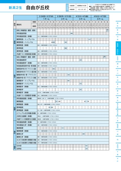 麹町新宿池袋秋葉原自由が丘吉祥寺調布立川町田厚木藤沢横浜あざみ野金沢文庫大宮南浦和川越柏津田沼千葉水戸3/24(日)~3/27(水)3/28(木)~3/31(日)4/2(火)~4/5(金)4/6(土)~4/7(日)1ターム2ターム3ターム4ターム12345612345612345612345609:00〜10:3010:50〜12:2013:20〜14:5015:10〜16:4017:00〜18:3018:50〜20:2009:00〜10:3010:50〜12:2013:20〜14:5015:10〜16:4017:00〜18:3018:50〜20:2009:00〜10:3010:50〜12:2013:20〜14:5015:10〜16:4017:00〜18:3018:50〜20:2009:00〜10:3010:50〜12:2013:20〜14:5015:10〜16:4017:00〜18:3018:50〜20:20清川4/6・7山中堀尾4/6・7飯島吉田尾崎松田國分小山※視聴可能期間:3/7(木)〜4/30(火)髙橋(慶)佐野※視聴可能期間:3/7(木)〜4/30(火)岩崎※視聴可能期間:3/7(木)〜4/30(火)近藤※視聴可能期間:3/7(木)〜4/30(火)水嶋※視聴可能期間:3/7(木)〜4/30(火)藤野※視聴可能期間:3/7(木)〜4/30(火)横田宮田※視聴可能期間:3/7(木)〜4/30(火)依田※視聴可能期間:3/7(木)〜4/30(火)依田※視聴可能期間:3/7(木)〜4/30(火)山本(洋)※視聴可能期間:3/7(木)〜4/30(火)依田※視聴可能期間:3/7(木)〜4/30(火)高橋(英)・山村・江※視聴可能期間:3/7(木)〜4/30(火)生田竹内流川木村・越野絵川・大野光田・坂下※視聴可能期間:3/7(木)〜4/30(火)大窪・脇坂井上・菅井※視聴可能期間:3/7(木)〜4/30(火)園※視聴可能期間:3/7(木)〜4/30(火)伊藤(さ)※視聴可能期間:3/7(木)〜4/30(火)高橋(英)※視聴可能期間:3/7(木)〜4/30(火)乾※視聴可能期間:3/7(木)〜4/30(火)浅利※視聴可能期間:3/7(木)〜4/30(火)木村※視聴可能期間:3/7(木)〜4/30(火)竹中青野※視聴可能期間:3/7(木)〜4/30(火)西浦※視聴可能期間:3/7(木)〜4/30(火)中村※視聴可能期間:3/7(木)〜4/30(火)西尾黒川永井時限時間講座名教科新高2準備英語-難関・標準-特別選抜英語特別選抜英語(映像)難関英語-トップレベル難関英語-ハイレベル難関英語(映像)標準英語標準英語(映像)共通テスト対策英語(映像)新高2準備数学-難関・標準-特別選抜数学特別選抜数学(映像)特別選抜理系数学中高一貫(映像)難関理系数学中高一貫-アドバンスト(速習)難関理系数学中高一貫-アドバンスト(速習)映像)難関数学中高一貫-アドバンスト難関数学中高一貫-アドバンスト(映像)難関数学-トップレベル難関数学-ハイレベル難関数学(映像)標準数学標準数学(映像)共通テスト対策数学(映像)特別選抜国語(映像)難関国語難関国語(映像)標準国語標準国語(映像)ビジュアル古文常識(映像)古典文法基礎(映像)共通テスト対策現代文(映像)特別選抜物理(映像)特別選抜化学(映像)難関物理難関物理(映像)難関化学難関化学(映像)はじめての高校理科(物理基礎)映像)はじめての高校理科(化学基礎)映像)日本史世界史英語数学国語理科地歴自由が丘校●2024年度/春期講習/東日本/自由が丘/高2生/パターン14452024_58_3_337_32_20231201170526.csv/1ページ校了時削除
