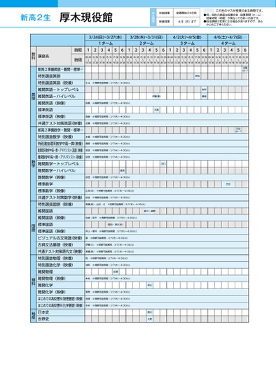 3/24(日)~3/27(水)3/28(木)~3/31(日)4/2(火)~4/5(金)4/6(土)~4/7(日)1ターム2ターム3ターム4ターム12345612345612345612345609:00〜10:3010:50〜12:2013:20〜14:5015:10〜16:4017:00〜18:3018:50〜20:2009:00〜10:3010:50〜12:2013:20〜14:5015:10〜16:4017:00〜18:3018:50〜20:2009:00〜10:3010:50〜12:2013:20〜14:5015:10〜16:4017:00〜18:3018:50〜20:2009:00〜10:3010:50〜12:2013:20〜14:5015:10〜16:4017:00〜18:3018:50〜20:20水野4/6・7伊吹安井横田古谷4/6・7古谷小山※視聴可能期間:3/7(木)〜4/30(火)佐野※視聴可能期間:3/7(木)〜4/30(火)岩崎※視聴可能期間:3/7(木)〜4/30(火)近藤※視聴可能期間:3/7(木)〜4/30(火)水嶋※視聴可能期間:3/7(木)〜4/30(火)藤野※視聴可能期間:3/7(木)〜4/30(火)宮田※視聴可能期間:3/7(木)〜4/30(火)依田※視聴可能期間:3/7(木)〜4/30(火)富田依田※視聴可能期間:3/7(木)〜4/30(火)伊藤(剛)大島川口山本(洋)※視聴可能期間:3/7(木)〜4/30(火)依田※視聴可能期間:3/7(木)〜4/30(火)高橋(英)・山村・江※視聴可能期間:3/7(木)〜4/30(火)絵川・越野光田・坂下※視聴可能期間:3/7(木)〜4/30(火)飯田・清水(め)井上・菅井※視聴可能期間:3/7(木)〜4/30(火)園※視聴可能期間:3/7(木)〜4/30(火)伊藤(さ)※視聴可能期間:3/7(木)〜4/30(火)高橋(英)※視聴可能期間:3/7(木)〜4/30(火)乾※視聴可能期間:3/7(木)〜4/30(火)浅利※視聴可能期間:3/7(木)〜4/30(火)矢野木村※視聴可能期間:3/7(木)〜4/30(火)青野※視聴可能期間:3/7(木)〜4/30(火)西浦※視聴可能期間:3/7(木)〜4/30(火)中村※視聴可能期間:3/7(木)〜4/30(火)早川黒川大野時限時間講座名教科新高2準備英語-難関・標準-特別選抜英語特別選抜英語(映像)難関英語-トップレベル難関英語-ハイレベル難関英語(映像)標準英語標準英語(映像)共通テスト対策英語(映像)新高2準備数学-難関・標準-特別選抜数学(映像)特別選抜理系数学中高一貫(映像)難関理系数学中高一貫-アドバンスト(速習)映像)難関数学中高一貫-アドバンスト(映像)難関数学-トップレベル難関数学-ハイレベル難関数学(映像)標準数学標準数学(映像)共通テスト対策数学(映像)特別選抜国語(映像)難関国語難関国語(映像)標準国語標準国語(映像)ビジュアル古文常識(映像)古典文法基礎(映像)共通テスト対策現代文(映像)特別選抜物理(映像)特別選抜化学(映像)難関物理難関物理(映像)難関化学難関化学(映像)はじめての高校理科(物理基礎)映像)はじめての高校理科(化学基礎)映像)日本史世界史英語数学国語理科地歴厚木現役館●2024年度/春期講習/東日本/厚木/高2生/パターン14452024_58_3_332_32_20231201170526.csv/1ページ校了時削除
