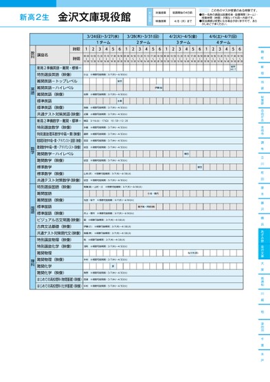 麹町新宿池袋秋葉原自由が丘吉祥寺調布立川町田厚木藤沢横浜あざみ野金沢文庫大宮南浦和川越柏津田沼千葉水戸3/24(日)~3/27(水)3/28(木)~3/31(日)4/2(火)~4/5(金)4/6(土)~4/7(日)1ターム2ターム3ターム4ターム12345612345612345612345609:00〜10:3010:50〜12:2013:20〜14:5015:10〜16:4017:00〜18:3018:50〜20:2009:00〜10:3010:50〜12:2013:20〜14:5015:10〜16:4017:00〜18:3018:50〜20:2009:00〜10:3010:50〜12:2013:20〜14:5015:10〜16:4017:00〜18:3018:50〜20:2009:00〜10:3010:50〜12:2013:20〜14:5015:10〜16:4018:50〜20:2017:00〜18:30安井4/6・7伊藤(宏小山※視聴可能期間:3/7(木)〜4/30(火)安井佐野※視聴可能期間:3/7(木)〜4/30(火)水野岩崎※視聴可能期間:3/7(木)〜4/30(火)近藤※視聴可能期間:3/7(木)〜4/30(火)横田3/16(土)・17(日)10:50〜12:20水嶋※視聴可能期間:3/7(木)〜4/30(火)藤野※視聴可能期間:3/7(木)〜4/30(火)宮田※視聴可能期間:3/7(木)〜4/30(火)依田※視聴可能期間:3/7(木)〜4/30(火)依田※視聴可能期間:3/7(木)〜4/30(火)山本(洋)※視聴可能期間:3/7(木)〜4/30(火)依田※視聴可能期間:3/7(木)〜4/30(火)高橋(英)・山村・江※視聴可能期間:3/7(木)〜4/30(火)小池・鹿内鹿子島・阿部(順)光田・坂下※視聴可能期間:3/7(木)〜4/30(火)井上・菅井※視聴可能期間:3/7(木)〜4/30(火)園※視聴可能期間:3/7(木)〜4/30(火)伊藤(さ)※視聴可能期間:3/7(木)〜4/30(火)高橋(英)※視聴可能期間:3/7(木)〜4/30(火)乾※視聴可能期間:3/7(木)〜4/30(火)浅利※視聴可能期間:3/7(木)〜4/30(火)木村※視聴可能期間:3/7(木)〜4/30(火)原青野※視聴可能期間:3/7(木)〜4/30(火)西浦※視聴可能期間:3/7(木)〜4/30(火)中村※視聴可能期間:3/7(木)〜4/30(火)横田富田佐々木(哲)時限時間講座名教科新高2準備英語-難関・標準-特別選抜英語(映像)難関英語-トップレベル難関英語-ハイレベル難関英語(映像)標準英語標準英語(映像)共通テスト対策英語(映像)新高2準備数学-難関・標準-特別選抜数学(映像)特別選抜理系数学中高一貫(映像)難関理系数学中高一貫-アドバンスト(速習)映像)難関数学中高一貫-アドバンスト(映像)難関数学-ハイレベル難関数学(映像)標準数学標準数学(映像)共通テスト対策数学(映像)特別選抜国語(映像)難関国語難関国語(映像)標準国語標準国語(映像)ビジュアル古文常識(映像)古典文法基礎(映像)共通テスト対策現代文(映像)特別選抜物理(映像)特別選抜化学(映像)難関物理難関物理(映像)難関化学難関化学(映像)はじめての高校理科(物理基礎)映像)はじめての高校理科(化学基礎)映像)英語数学国語理科金沢文庫現役館●2024年度/春期講習/東日本/金沢文庫/高2生/パターン14452024_58_3_335_32_20231201170526.csv/1ページ校了時削除
