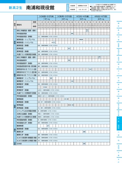 麹町新宿池袋秋葉原自由が丘吉祥寺調布立川町田厚木藤沢横浜あざみ野金沢文庫大宮南浦和川越柏津田沼千葉水戸3/24(日)~3/27(水)3/28(木)~3/31(日)4/2(火)~4/5(金)4/6(土)~4/7(日)1ターム2ターム3ターム4ターム12345612345612345612345609:00〜10:3010:50〜12:2013:20〜14:5015:10〜16:4017:00〜18:3018:50〜20:2009:00〜10:3010:50〜12:2013:20〜14:5015:10〜16:4017:00〜18:3018:50〜20:2009:00〜10:3010:50〜12:2013:20〜14:5015:10〜16:4018:50〜20:2009:00〜10:3010:50〜12:2013:20〜14:5015:10〜16:4017:00〜18:3018:50〜20:2017:00〜18:30村上4/2・3永島4/6・7河本篠原髙橋(慶)成川岡田永島小山※視聴可能期間:3/7(木)〜4/30(火)田中(久)佐野※視聴可能期間:3/7(木)〜4/30(火)岩崎※視聴可能期間:3/7(木)〜4/30(火)近藤※視聴可能期間:3/7(木)〜4/30(火)水嶋※視聴可能期間:3/7(木)〜4/30(火)藤野※視聴可能期間:3/7(木)〜4/30(火)宮田※視聴可能期間:3/7(木)〜4/30(火)依田※視聴可能期間:3/7(木)〜4/30(火)秦野依田※視聴可能期間:3/7(木)〜4/30(火)中村(隆)山本(洋)※視聴可能期間:3/7(木)〜4/30(火)依田※視聴可能期間:3/7(木)〜4/30(火)高橋(英)・山村・江※視聴可能期間:3/7(木)〜4/30(火)一瀬・脇坂清水(直)・品田光田・坂下※視聴可能期間:3/7(木)〜4/30(火)井上・菅井※視聴可能期間:3/7(木)〜4/30(火)園※視聴可能期間:3/7(木)〜4/30(火)伊藤(さ)※視聴可能期間:3/7(木)〜4/30(火)高橋(英)※視聴可能期間:3/7(木)〜4/30(火)乾※視聴可能期間:3/7(木)〜4/30(火)浅利※視聴可能期間:3/7(木)〜4/30(火)金子木村※視聴可能期間:3/7(木)〜4/30(火)青野※視聴可能期間:3/7(木)〜4/30(火)西浦※視聴可能期間:3/7(木)〜4/30(火)中村※視聴可能期間:3/7(木)〜4/30(火)國兼富増時限時間講座名教科新高2準備英語-難関・標準-特別選抜英語特別選抜英語(映像)難関英語-トップレベル難関英語-ハイレベル難関英語(映像)標準英語標準英語(映像)共通テスト対策英語(映像)新高2準備数学-難関・標準-特別選抜数学特別選抜数学(映像)特別選抜理系数学中高一貫(映像)難関理系数学中高一貫-アドバンスト(速習)難関理系数学中高一貫-アドバンスト(速習)映像)難関数学中高一貫-アドバンスト(映像)難関数学-トップレベル難関数学-ハイレベル難関数学(映像)標準数学標準数学(映像)共通テスト対策数学(映像)特別選抜国語(映像)難関国語難関国語(映像)標準国語標準国語(映像)ビジュアル古文常識(映像)古典文法基礎(映像)共通テスト対策現代文(映像)特別選抜物理(映像)特別選抜化学(映像)難関物理難関物理(映像)難関化学難関化学(映像)はじめての高校理科(物理基礎)映像)はじめての高校理科(化学基礎)映像)日本史英語数学国語理科地歴南浦和現役館●2024年度/春期講習/東日本/南浦和/高2生/パターン14452024_58_3_336_32_20231201170526.csv/1ページ校了時削除