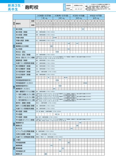 3/24(日)~3/27(水)3/28(木)~3/31(日)4/2(火)~4/5(金)4/6(土)~4/7(日)1ターム2ターム3ターム4ターム12345612345612345612345609:00〜10:3010:50〜12:2013:20〜14:5015:10〜16:4017:00〜18:3018:50〜20:2009:00〜10:3010:50〜12:2013:20〜14:5015:10〜16:4017:00〜18:3018:50〜20:2009:00〜10:3010:50〜12:2013:20〜14:5015:10〜16:4017:00〜18:3018:50〜20:2009:00〜10:3010:50〜12:2013:20〜14:5015:10〜16:4017:00〜18:3018:50〜20:20時限時間講座名教科麹町校墺高沢※視聴可能期間:3/7(木)〜4/30(火)佐野※視聴可能期間:3/7(木)〜4/30(火)村上※視聴可能期間:3/7(木)〜4/30(火)木村(智)新野木村(智)永井小森秋谷小林※視聴可能期間:3/7(木)〜4/30(火)ご自宅でタブレットやスマートフォン、パソコンなどで受講する「ライブ配信型」の授業です。見逃し配信でも受講いただけます。成川17:00〜18:30/19:00〜20:304/6(土)〜4/7(日)堂前※視聴可能期間:3/7(木)〜4/30(火)宮下※視聴可能期間:3/7(木)〜4/30(火)香坂※視聴可能期間:3/7(木)〜4/30(火)刈谷※視聴可能期間:3/7(木)〜4/30(火)山本(敏)※視聴可能期間:3/7(木)〜4/30(火)西浦※視聴可能期間:3/7(木)〜4/30(火)隣口(哲)中村(敬)中村(敬)尾台成合※視聴可能期間:3/7(木)〜4/30(火)伊東(敦)4/7(日)4/6(土)9:30〜11:00/11:20〜12:50ご自宅でタブレットやスマートフォン、パソコンなどで受講する「ライブ配信型」の授業です。見逃し配信でも受講いただけます。森本ご自宅でタブレットやスマートフォン、パソコンなどで受講する「ライブ配信型」の授業です。見逃し配信でも受講いただけます。佐野ご自宅でタブレットやスマートフォン、パソコンなどで受講する「ライブ配信型」の授業です。見逃し配信でも受講いただけます。森本13:40〜15:10/15:30〜17:00※大学受験科生専用の講座です。4/6(土)9:30〜11:00/11:20〜12:50※大学受験科生専用の講座です。※大学受験科生専用の講座です。高梨(大)※視聴可能期間:3/7(木)〜4/30(火)大庭※視聴可能期間:3/7(木)〜4/30(火)水嶋※視聴可能期間:3/7(木)〜4/30(火)三河・園・髙橋(佳)※視聴可能期間:3/7(木)〜4/30(火)菱山・佐河※視聴可能期間:3/7(木)〜4/30(火)兵頭・太田ご自宅でタブレットやスマートフォン、パソコンなどで受講する「ライブ配信型」の授業です。見逃し配信でも受講いただけます。木村・隼坂17:00〜18:30/19:00〜20:304/8(月)〜4/9(火)手塚小野木太田園※視聴可能期間:3/7(木)〜4/30(火)伊藤(さ)※視聴可能期間:3/7(木)〜4/30(火)高橋(英)・伊藤(さ)・江※視聴可能期間:3/7(木)〜4/30(火)合田宮元杉山寺田木村樹葉東大英語東大英語(映像)京大英語(映像)早慶大英語早慶大英語(映像)医進英語難関国公立大英語私大英語英文法・語法英文法・語法(映像)英文法・語法(オンライン授業)基礎英語(映像)共通テスト対策英語(映像)東大理類数学(映像)東大文類数学(映像)京大理系数学(映像)京大文系数学(映像)医進数学特別選抜理系数学ⅢC特別選抜数学ⅠAⅡBC難関理系数学ⅢC難関数学ⅠAⅡBC標準・難関数学(ベクトル)映像)テーマ数学(三角関数)オンライン授業)テーマ数学(ベクトル)オンライン授業)テーマ数学(複素数平面)オンライン授業)数学Ⅲ[基礎]映像)数学ⅠAⅡ演習[基礎]映像)共通テスト対策数学(映像)東大国語(映像)早大国語早大国語(映像)早大国語(オンライン授業)難関現代文難関古文私大古文ビジュアル古文常識(映像)古典文法基礎(映像)共通テスト対策国語(映像)小論文特別選抜物理難関物理標準物理特別選抜化学難関化学英語数学国語小論文理科●2024年度/春期講習/東日本/麹町/高3・卒生/パターン14452024_58_3_328_11_20231201170500.csv/1ページ校了時削除