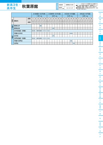 本郷麹町新宿池袋秋葉原自由が丘吉祥寺調布立川町田厚木藤沢横浜あざみ野金沢文庫大宮南浦和川越柏津田沼千葉水戸3/24(日)~3/27(水)3/28(木)~3/31(日)4/2(火)~4/5(金)4/6(土)~4/7(日)1ターム2ターム3ターム4ターム12345612345612345612345609:00〜10:3010:50〜12:2013:20〜14:5015:10〜16:4017:00〜18:3018:50〜20:2009:00〜10:3010:50〜12:2013:20〜14:5015:10〜16:4017:00〜18:3018:50〜20:2009:00〜10:3010:50〜12:2013:20〜14:5015:10〜16:4017:00〜18:3018:50〜20:2009:00〜10:3010:50〜12:2013:20〜14:5015:10〜16:4017:00〜18:3018:50〜20:20時限時間安東坂本(勝)※視聴可能期間:3/7(木)〜4/30(火)坂本(新)※視聴可能期間:3/7(木)〜4/30(火)山野井大内坂本(勝)沼田平尾講座名標準化学標準生物日本史論述(映像)早慶大日本史日本史世界史論述(映像)早慶大世界史世界史教科理科地歴秋葉原館●2024年度/春期講習/東日本/秋葉原/高3・卒生/パターン14452024_58_3_368_11_20231201170500.csv/2ページ校了時削除