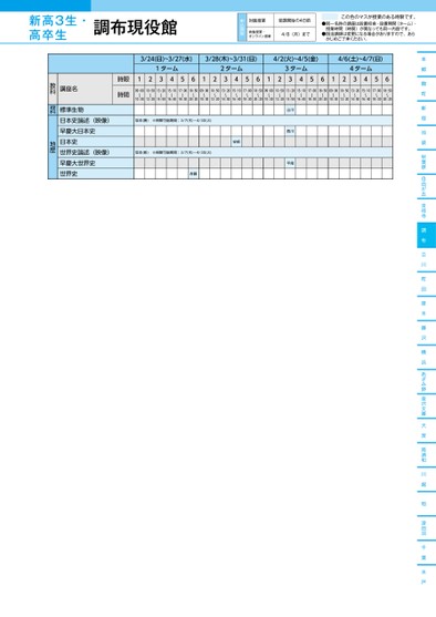 本郷麹町新宿池袋秋葉原自由が丘吉祥寺調布立川町田厚木藤沢横浜あざみ野金沢文庫大宮南浦和川越柏津田沼千葉水戸3/24(日)~3/27(水)3/28(木)~3/31(日)4/2(火)~4/5(金)4/6(土)~4/7(日)1ターム2ターム3ターム4ターム12345612345612345612345609:00〜10:3010:50〜12:2013:20〜14:5015:10〜16:4017:00〜18:3018:50〜20:2009:00〜10:3010:50〜12:2013:20〜14:5015:10〜16:4017:00〜18:3018:50〜20:2009:00〜10:3010:50〜12:2013:20〜14:5015:10〜16:4017:00〜18:3018:50〜20:2009:00〜10:3010:50〜12:2013:20〜14:5015:10〜16:4017:00〜18:3018:50〜20:20時限時間坂本(勝)※視聴可能期間:3/7(木)〜4/30(火)坂本(新)※視聴可能期間:3/7(木)〜4/30(火)安部斉藤山川西川平尾講座名標準生物日本史論述(映像)早慶大日本史日本史世界史論述(映像)早慶大世界史世界史教科理科地歴調布現役館●2024年度/春期講習/東日本/調布/高3・卒生/パターン14452024_58_3_367_11_20231201170500.csv/2ページ校了時削除