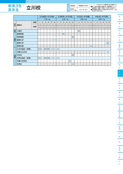 本郷麹町新宿池袋秋葉原自由が丘吉祥寺調布立川町田厚木藤沢横浜あざみ野金沢文庫大宮南浦和川越柏津田沼千葉水戸3/24(日)~3/27(水)3/28(木)~3/31(日)4/2(火)~4/5(金)4/6(土)~4/7(日)1ターム2ターム3ターム4ターム12345612345612345612345609:00〜10:3010:50〜12:2013:20〜14:5015:10〜16:4017:00〜18:3018:50〜20:2009:00〜10:3010:50〜12:2013:20〜14:5015:10〜16:4017:00〜18:3018:50〜20:2009:00〜10:3010:50〜12:2013:20〜14:5015:10〜16:4017:00〜18:3018:50〜20:2009:00〜10:3010:50〜12:2013:20〜14:5015:10〜16:4017:00〜18:3018:50〜20:20時限時間柴田長谷川宮原沖坂本(勝)※視聴可能期間:3/7(木)〜4/30(火)坂本(新)※視聴可能期間:3/7(木)〜4/30(火)安部永井山口山川安達竹内講座名小論文難関物理標準物理難関化学標準化学標準生物日本史論述(映像)早慶大日本史日本史世界史論述(映像)早慶大世界史世界史教科小論文理科地歴立川校●2024年度/春期講習/東日本/立川/高3・卒生/パターン14452024_58_3_315_11_20231201170500.csv/2ページ校了時削除
