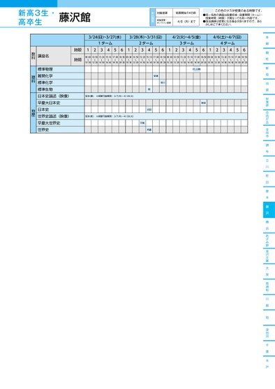 本郷麹町新宿池袋秋葉原自由が丘吉祥寺調布立川町田厚木藤沢横浜あざみ野金沢文庫大宮南浦和川越柏津田沼千葉水戸3/24(日)~3/27(水)3/28(木)~3/31(日)4/2(火)~4/5(金)4/6(土)~4/7(日)1ターム2ターム3ターム4ターム12345612345612345612345609:00〜10:3010:50〜12:2013:20〜14:5015:10〜16:4017:00〜18:3018:50〜20:2009:00〜10:3010:50〜12:2013:20〜14:5015:10〜16:4017:00〜18:3018:50〜20:2009:00〜10:3010:50〜12:2013:20〜14:5015:10〜16:4017:00〜18:3018:50〜20:2009:00〜10:3010:50〜12:2013:20〜14:5015:10〜16:4017:00〜18:3018:50〜20:20時限時間坂本(勝)※視聴可能期間:3/7(木)〜4/30(火)坂本(新)※視聴可能期間:3/7(木)〜4/30(火)安達早川岡太田斉藤平尾井上(順)依田講座名標準物理難関化学標準化学標準生物日本史論述(映像)早慶大日本史日本史世界史論述(映像)早慶大世界史世界史教科理科地歴藤沢館●2024年度/春期講習/東日本/藤沢/高3・卒生/パターン14452024_58_3_331_11_20231201170500.csv/2ページ校了時削除