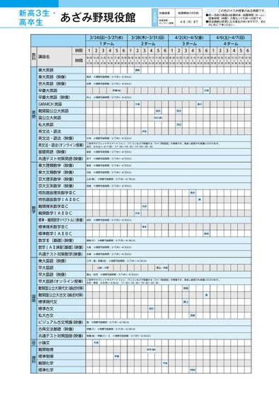 3/24(日)~3/27(水)3/28(木)~3/31(日)4/2(火)~4/5(金)4/6(土)~4/7(日)1ターム2ターム3ターム4ターム12345612345612345612345609:00〜10:3010:50〜12:2013:20〜14:5015:10〜16:4017:00〜18:3018:50〜20:2009:00〜10:3010:50〜12:2013:20〜14:5015:10〜16:4017:00〜18:3018:50〜20:2009:00〜10:3010:50〜12:2013:20〜14:5015:10〜16:4017:00〜18:3018:50〜20:2009:00〜10:3010:50〜12:2013:20〜14:5015:10〜16:4017:00〜18:3018:50〜20:20時限時間講座名教科あざみ野現役館高沢※視聴可能期間:3/7(木)〜4/30(火)佐野※視聴可能期間:3/7(木)〜4/30(火)伊藤(宏)村上※視聴可能期間:3/7(木)〜4/30(火)瀬﨑大島小林※視聴可能期間:3/7(木)〜4/30(火)伊吹大胡清川安井吉川(幸)岡本吉田ご自宅でタブレットやスマートフォン、パソコンなどで受講する「ライブ配信型」の授業です。見逃し配信でも受講いただけます。成川17:00〜18:30/19:00〜20:304/6(土)〜4/7(日)堂前※視聴可能期間:3/7(木)〜4/30(火)宮下※視聴可能期間:3/7(木)〜4/30(火)香坂※視聴可能期間:3/7(木)〜4/30(火)刈谷※視聴可能期間:3/7(木)〜4/30(火)山本(敏)※視聴可能期間:3/7(木)〜4/30(火)西浦※視聴可能期間:3/7(木)〜4/30(火)成合※視聴可能期間:3/7(木)〜4/30(火)古谷古谷塚本高梨(大)※視聴可能期間:3/7(木)〜4/30(火)大庭※視聴可能期間:3/7(木)〜4/30(火)水嶋※視聴可能期間:3/7(木)〜4/30(火)三河・園・髙橋(佳)※視聴可能期間:3/7(木)〜4/30(火)山崎・大野菱山・宮崎菱山・佐河※視聴可能期間:3/7(木)〜4/30(火)板谷隣前田ご自宅でタブレットやスマートフォン、パソコンなどで受講する「ライブ配信型」の授業です。見逃し配信でも受講いただけます。木村・隼坂17:00〜18:30/19:00〜20:304/8(月)〜4/9(火)和田園※視聴可能期間:3/7(木)〜4/30(火)伊藤(さ)※視聴可能期間:3/7(木)〜4/30(火)高橋(英)・伊藤(さ)・江※視聴可能期間:3/7(木)〜4/30(火)中塚鈴木(誠)宇都園斎藤菱山宮崎今枝宇野沢東大英語東大英語(映像)京大英語(映像)早慶大英語早慶大英語(映像)GMARCH英語難関国公立大英語国公立大英語私大英語英文法・語法英文法・語法(映像)英文法・語法(オンライン授業)基礎英語(映像)共通テスト対策英語(映像)東大理類数学(映像)東大文類数学(映像)京大理系数学(映像)京大文系数学(映像)特別選抜理系数学ⅢC特別選抜数学ⅠAⅡBC難関理系数学ⅢC難関数学ⅠAⅡBC標準・難関数学(ベクトル)映像)標準理系数学ⅢC標準数学ⅠAⅡBC数学Ⅲ[基礎]映像)数学ⅠAⅡ演習[基礎]映像)共通テスト対策数学(映像)東大国語(映像)早大国語早大国語(映像)早大国語(オンライン授業)難関国公立大現代文(論述対策)難関国公立大古文(論述対策)標準現代文標準古文私大古文ビジュアル古文常識(映像)古典文法基礎(映像)共通テスト対策国語(映像)小論文難関物理標準物理難関化学標準化学英語数学国語小論文理科●2024年度/春期講習/東日本/あざみ野/高3・卒生/パターン14452024_58_3_339_11_20231201170500.csv/1ページ校了時削除
