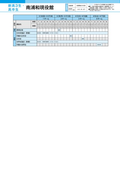 3/24(日)~3/27(水)3/28(木)~3/31(日)4/2(火)~4/5(金)4/6(土)~4/7(日)1ターム2ターム3ターム4ターム12345612345612345612345609:00〜10:3010:50〜12:2013:20〜14:5015:10〜16:4017:00〜18:3018:50〜20:2009:00〜10:3010:50〜12:2013:20〜14:5015:10〜16:4017:00〜18:3018:50〜20:2009:00〜10:3010:50〜12:2013:20〜14:5015:10〜16:4017:00〜18:3018:50〜20:2009:00〜10:3010:50〜12:2013:20〜14:5015:10〜16:4017:00〜18:3018:50〜20:20時限時間坂本(勝)※視聴可能期間:3/7(木)〜4/30(火)倉田坂本(新)※視聴可能期間:3/7(木)〜4/30(火)西川富増坂本(新)講座名標準生物日本史論述(映像)早慶大日本史日本史世界史論述(映像)早慶大世界史教科理科地歴南浦和現役館●2024年度/春期講習/東日本/南浦和/高3・卒生/パターン14452024_58_3_336_11_20231201170500.csv/2ページ校了時削除