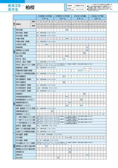 3/24(日)~3/27(水)3/28(木)~3/31(日)4/2(火)~4/5(金)4/6(土)~4/7(日)1ターム2ターム3ターム4ターム12345612345612345612345609:00〜10:3010:50〜12:2013:20〜14:5015:10〜16:4017:00〜18:3018:50〜20:2009:00〜10:3010:50〜12:2013:20〜14:5015:10〜16:4017:00〜18:3018:50〜20:2009:00〜10:3010:50〜12:2013:20〜14:5015:10〜16:4017:00〜18:3018:50〜20:2009:00〜10:3010:50〜12:2013:20〜14:5015:10〜16:4017:00〜18:3018:50〜20:20時限時間講座名教科柏校高沢※視聴可能期間:3/7(木)〜4/30(火)佐野※視聴可能期間:3/7(木)〜4/30(火)村上※視聴可能期間:3/7(木)〜4/30(火)濱崎田村(喜)仲野成川高橋(勝)えんどう小林※視聴可能期間:3/7(木)〜4/30(火)山川篠原加藤ご自宅でタブレットやスマートフォン、パソコンなどで受講する「ライブ配信型」の授業です。見逃し配信でも受講いただけます。成川17:00〜18:30/19:00〜20:304/6(土)〜4/7(日)13:20~15:30えんどう堂前※視聴可能期間:3/7(木)〜4/30(火)宮下※視聴可能期間:3/7(木)〜4/30(火)香坂※視聴可能期間:3/7(木)〜4/30(火)刈谷※視聴可能期間:3/7(木)〜4/30(火)山本(敏)※視聴可能期間:3/7(木)〜4/30(火)西浦※視聴可能期間:3/7(木)〜4/30(火)鈴木飯島宮本鈴木鈴木郷田郷田口(千)成合※視聴可能期間:3/7(木)〜4/30(火)成合永島4/7(日)4/6(土)9:30〜11:00/11:20〜12:50ご自宅でタブレットやスマートフォン、パソコンなどで受講する「ライブ配信型」の授業です。見逃し配信でも受講いただけます。森本ご自宅でタブレットやスマートフォン、パソコンなどで受講する「ライブ配信型」の授業です。見逃し配信でも受講いただけます。佐野ご自宅でタブレットやスマートフォン、パソコンなどで受講する「ライブ配信型」の授業です。見逃し配信でも受講いただけます。森本13:40〜15:10/15:30〜17:00※大学受験科生専用の講座です。4/6(土)9:30〜11:00/11:20〜12:50※大学受験科生専用の講座です。※大学受験科生専用の講座です。高梨(大)※視聴可能期間:3/7(木)〜4/30(火)大庭※視聴可能期間:3/7(木)〜4/30(火)水嶋※視聴可能期間:3/7(木)〜4/30(火)三河・園・髙橋(佳)※視聴可能期間:3/7(木)〜4/30(火)菱山・佐河※視聴可能期間:3/7(木)〜4/30(火)小池・隼坂ご自宅でタブレットやスマートフォン、パソコンなどで受講する「ライブ配信型」の授業です。見逃し配信でも受講いただけます。木村・隼坂17:00〜18:30/19:00〜20:304/8(月)〜4/9(火)立川佐河松藤今西川崎東大英語東大英語(映像)京大英語(映像)早慶大英語早慶大英語(映像)GMARCH英語医進英語難関国公立大英語国公立大英語私大英語英文法・語法英文法・語法(映像)英文法・語法(オンライン授業)基礎英語(映像)受験英語の基礎の基礎共通テスト対策英語(映像)東大理類数学東大理類数学(映像)東大文類数学東大文類数学(映像)京大理系数学(映像)京大文系数学(映像)医進数学特別選抜理系数学ⅢC特別選抜数学ⅠAⅡBC難関理系数学ⅢC難関数学ⅠAⅡBC標準・難関数学(ベクトル)映像)標準理系数学ⅢC標準数学ⅠAⅡBCテーマ数学(三角関数)オンライン授業)テーマ数学(ベクトル)オンライン授業)テーマ数学(複素数平面)オンライン授業)数学Ⅲ[基礎]映像)数学ⅠAⅡ演習[基礎]映像)共通テスト対策数学(映像)東大国語(映像)早大国語早大国語(映像)早大国語(オンライン授業)難関国公立大現代文(論述対策)難関国公立大古文(論述対策)標準現代文標準古文私大古文英語数学国語●2024年度/春期講習/東日本/柏/高3・卒生/パターン14452024_58_3_322_11_20231201170500.csv/1ページ校了時削除