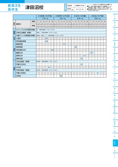 本郷麹町新宿池袋秋葉原自由が丘吉祥寺調布立川町田厚木藤沢横浜あざみ野金沢文庫大宮南浦和川越柏津田沼千葉水戸3/24(日)~3/27(水)3/28(木)~3/31(日)4/2(火)~4/5(金)4/6(土)~4/7(日)1ターム2ターム3ターム4ターム12345612345612345612345609:00〜10:3010:50〜12:2013:20〜14:5015:10〜16:4017:00〜18:3018:50〜20:2009:00〜10:3010:50〜12:2013:20〜14:5015:10〜16:4017:00〜18:3018:50〜20:2009:00〜10:3010:50〜12:2013:20〜14:5015:10〜16:4017:00〜18:3018:50〜20:2009:00〜10:3010:50〜12:2013:20〜14:5015:10〜16:4017:00〜18:3018:50〜20:20園※視聴可能期間:3/7(木)〜4/30(火)伊藤(さ)※視聴可能期間:3/7(木)〜4/30(火)高橋(英)・伊藤(さ)・江※視聴可能期間:3/7(木)〜4/30(火)陣野鈴木(誠)樹葉合田宮原坂本(勝)※視聴可能期間:3/7(木)〜4/30(火)黒川坂本(新)※視聴可能期間:3/7(木)〜4/30(火)西尾古川三浦大内髙岡大野講座名時限時間ビジュアル古文常識(映像)古典文法基礎(映像)共通テスト対策国語(映像)小論文特別選抜物理難関物理標準物理特別選抜化学難関化学標準化学標準生物日本史論述(映像)早慶大日本史日本史世界史論述(映像)早慶大世界史世界史教科国語小論文理科地歴津田沼校●2024年度/春期講習/東日本/津田沼/高3・卒生/パターン14452024_58_3_327_11_20231201170500.csv/2ページ校了時削除