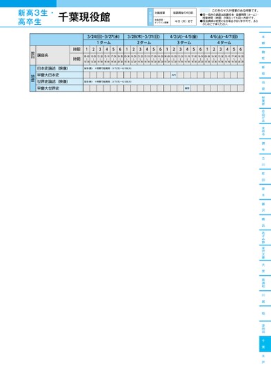 本郷麹町新宿池袋秋葉原自由が丘吉祥寺調布立川町田厚木藤沢横浜あざみ野金沢文庫大宮南浦和川越柏津田沼千葉水戸3/24(日)~3/27(水)3/28(木)~3/31(日)4/2(火)~4/5(金)4/6(土)~4/7(日)1ターム2ターム3ターム4ターム12345612345612345612345609:00〜10:3010:50〜12:2013:20〜14:5015:10〜16:4017:00〜18:3018:50〜20:2009:00〜10:3010:50〜12:2013:20〜14:5015:10〜16:4017:00〜18:3018:50〜20:2009:00〜10:3010:50〜12:2013:20〜14:5015:10〜16:4017:00〜18:3018:50〜20:2009:00〜10:3010:50〜12:2013:20〜14:5015:10〜16:4017:00〜18:3018:50〜20:20時限時間坂本(勝)※視聴可能期間:3/7(木)〜4/30(火)坂本(新)※視聴可能期間:3/7(木)〜4/30(火)大内髙岡講座名日本史論述(映像)早慶大日本史世界史論述(映像)早慶大世界史教科地歴千葉現役館●2024年度/春期講習/東日本/千葉/高3・卒生/パターン14452024_58_3_334_11_20231201170500.csv/2ページ校了時削除