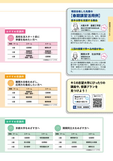 講座選びのSTEP現役合格した先輩の【春期講習活用例】苦手分野を克服する機会おすすめ受講例高校生活スタート前に準備を始めたい方へ時限/ターム4限5限6限2ターム(自習室)準備数学-特別選抜-準備国語-難関・標準-4ターム難関化学準備英語-特別選抜-(自習室)※時間割はイメージです。おすすめ受講例難関大合格をめざし、応用力を養成したい方へ時限/ターム4限5限6限1ターム準備数学-難関・標準-難関英語(自習室)3ターム(自習室)標準数学難関物理※時間割はイメージです。大阪大学基礎工学部龍谷大学付属平安高校出身三谷和耀さん合格大学別講座はレベルの高い問題がたくさんあり、とても勉強になりました。また、単元別の講座は苦手分野を克服する機会になりました。勉強方法も詳しく教えてもらい、素直に実行すると力がつきました。1回の授業で学べる内容が多い関西大学社会学部南陽高校出身早川結衣さん合格はじめて春期講習を受講したときに1回の授業で学べる内容が多く、衝撃を受けました。予習・復習のやり方も教えてもらい、その通りにやっていくと成績の伸びを実感できました。キミの志望大学にぴったりの講座や、受講プランを見つけよう!スマートフォンで簡単アクセスWebサイトでチェック!●講座の選び方河合塾春期講習おすすめ受講例京都大学をめざす方へ関関同立大をめざす方へ時限/ターム2限3限4限2ターム(自習室)京大英語京大数学3ターム時限/ターム特別選抜物理(自習室)特別選抜化学2限3限4限2ターム標準現代文日本史(自習室)4ターム(自習室)関関同立大英語標準古文※時間割はイメージです。