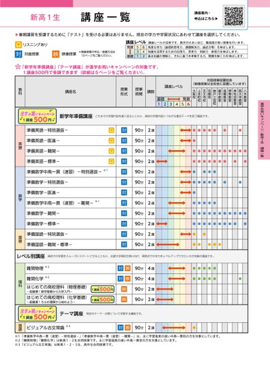 進学お祝いキャンペーン/新高1生講座一覧対面授業設置校舎(映像授業は全校舎に設置しています)八木教室西大寺教室岸和田教室堺東教室高槻教室豊中教室神戸三宮校京都校天王寺校上本町校大阪校講座レベル基礎12発展5634授業形式授業時間講数講座名教科「新学年準備講座」「テーマ講座」が進学お祝いキャンペーンの対象です。1講座500円で受講できます(詳細は5ページをご覧ください)。1講座円500新学年準備講座これまでの学習内容を振り返るとともに、高校の学習内容につながる重点テーマを扱う講座です。●●●●●●●●●●●●●●●●●●●●●●●●●●●●●●●●●●●●●●●●●●●●●●●●●●●●●●●●●●●●●●●●●●●●●●●●●対対対対対対対対対対対対90分2講90分2講90分2講90分2講90分2講90分2講90分2講90分2講90分2講90分2講90分2講90分2講準備英語-特別選抜-準備英語-標準-準備英語-医進-準備英語-難関-英語準備数学中高一貫(速習)-特別選抜-※1準備数学-特別選抜-準備数学-医進-準備数学中高一貫(速習)-難関-※1準備数学-難関-準備数学-標準-準備国語-特別選抜-準備国語-難関・標準-数学国語レベル別講座高校での学習をスムーズにスタートさせるとともに、志望大学現役合格に向け、現時点での学力をレベルアップさせたい方が対象の講座です。対映90分4講対映90分4講映映90分2講90分2講●●●●●●●●●●●1講座円5005001講座円難関化学※2はじめての高校理科(物理基礎)-超重要!数学理解から力学入門-はじめての高校理科(化学基礎)-超重要!モルの理解から始めよう-理科難関物理※2※1「準備数学中高一貫(速習)-特別選抜-」「準備数学中高一貫(速習)-難関-」は、主に学習進度の速い中高一貫校の方を対象としています。※2「難関物理」「難関化学」は新高1・2生合同授業です。主に学習進度の速い中高一貫校の方を対象としています。※3「ビジュアル古文常識」は新高1・2・3生、高卒生合同授業です。対映90分2講●ビジュアル古文常識※3国語1講座円500テーマ講座特定のテーマ・分野について学習する講座です。新高1生講座一覧講座案内・申込はこちら▶▶春期講習を受講するために「テスト」を受ける必要はありません。現在の学力や学習状況にあわせて講座を選択してください。リスニングあり対対面授業映映像授業*映像授業の申込・受講方法は15ページをご覧ください。基礎講座レベル講座レベルの目安です。数字が大きいほど、難易度の高い授業を行います。発展高度な学力(論理的思考力、課題解決力、論述力等)を伸ばします。知識を活用するための応用力、思考力・判断力・表現力を伸ばします。基本知識の理解と、それに基づき考察する力、問題を解く力を伸ばします。531642
