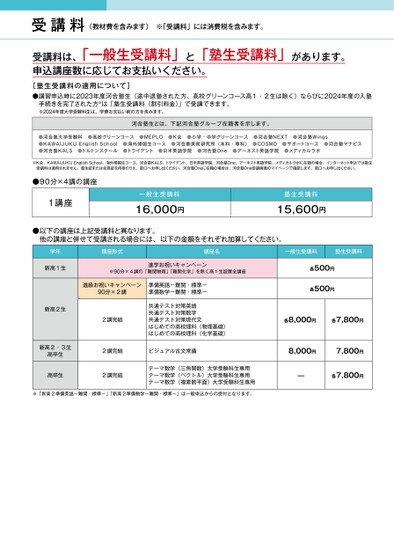 受講料(教材費を含みます)※「受講料」には消費税を含みます。受講料は、「一般生受講料」と「塾生受講料」があります。申込講座数に応じてお支払いください。[塾生受講料の適用について]●講習申込時に2023年度河合塾生(途中退塾された方、高校グリーンコース高1・2生は除く)ならびに2024年度の入塾手続きを完了された方※は「塾生受講料(割引料金)」で受講できます。※2024年度大学受験科生は、学費お支払い前の方を含みます。河合塾生とは、下記河合塾グループ在籍者を示します。●河合塾大学受験科●高校グリーンコース●MEPLO●K会●小学・中学グリーンコース●河合塾NEXT●河合塾Winɡs●KAWAIJUKUEnɡlishSchool●海外帰国生コース●河合塾美術研究所(本科・専科)●COSMO●サポートコース●河合塾マナビス●河合塾KALS●ドルトンスクール●トライデント●日米英語学院●河合塾One●アーネスト英語学院●メディカルラボ※K会、KAWAIJUKUEnɡlishSchool、海外帰国生コース、河合塾KALS、トライデント、日米英語学院、河合塾One、アーネスト英語学院、メディカルラボに在籍の場合、インターネット申込では塾生受講料は適用されません。塾生証または会員証を持参のうえ、窓口へお申し出ください。河合塾Oneに在籍の場合は、河合塾One受講画面のマイページで確認します。窓口へお申し出ください。●90分×4講の講座1講座一般生受講料16,000円塾生受講料15,600円●以下の講座は上記受講料と異なります。他の講座と併せて受講される場合には、以下の金額をそれぞれ加算してください。講座形式講座名一般生受講料塾生受講料各500円各500円各8,000円各7,800円8,000円7,800円—各7,800円学年新高1生新高2生進学お祝いキャンペーン※90分×4講の「難関物理」「難関化学」を除く高1生設置全講座進級お祝いキャンペーン90分×2講準備英語-難関・標準-準備数学-難関・標準-2講完結共通テスト対策英語共通テスト対策数学共通テスト対策現代文はじめての高校理科(物理基礎)はじめての高校理科(化学基礎)新高2・3生高卒生2講完結ビジュアル古文常識高卒生2講完結テーマ数学(三角関数)大学受験科生専用テーマ数学(ベクトル)大学受験科生専用テーマ数学(複素数平面)大学受験科生専用※「新高2準備英語-難関・標準-」「新高2準備数学-難関・標準-」は一般申込からの受付となります。