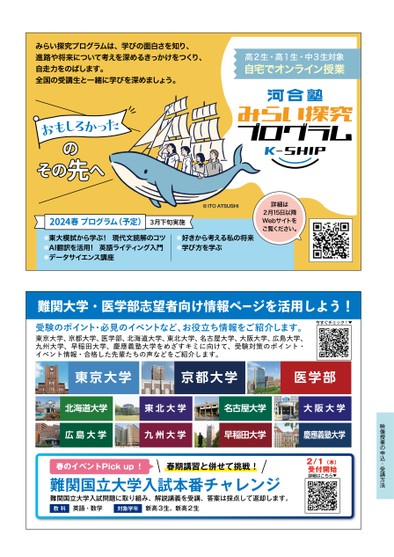 映像授業の申込・受講方法難関大学・医学部志望者向け情報ページを活用しよう!受験のポイント・必見のイベントなど、お役立ち情報をご紹介します。東京大学、京都大学、医学部、北海道大学、東北大学、名古屋大学、大阪大学、広島大学、九州大学、早稲田大学、慶應義塾大学をめざすキミに向けて、受験対策のポイント・イベント情報・合格した先輩たちの声などをご紹介します。今すぐチェック!▶東京大学京都大学医学部北海道大学東北大学名古屋大学大阪大学広島大学九州大学早稲田大学慶應義塾大学春のイベントPickup!春期講習と併せて挑戦!難関国立大学入試本番チャレンジ難関国立大学入試問題に取り組み、解説講義を受講、答案は採点して返却します。教科英語・数学対象学年新高3生、新高2生2/1(木)受付開始詳細はこちら▶