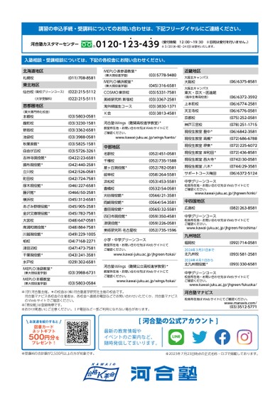 講習の申込手続・受講料についてのお問い合わせは、下記フリーダイヤルにご連絡ください。河合塾カスタマーセンター®0120-12●3-43●9(受付時間12:00〜19:30※日祝は受付を行いません。)※3/20(水・祝)・24日)は受付いたします。入塾相談・受講相談については、下記の各校舎にお問い合わせください。(011)708-8581北海道地区札幌校東北地区仙台校(高校グリーンコース)(022)215-5112(022)215-5111(大学受験科)首都圏地区〈東大専門特化校舎〉本郷校麹町校新宿校池袋校秋葉原館*自由が丘校吉祥寺現役館*調布現役館*立川校町田校厚木現役館*藤沢館*横浜校あざみ野現役館*金沢文庫現役館*大宮校南浦和現役館*川越現役館*柏校津田沼校千葉現役館*水戸校MEPLO池袋教室*(東大現役進学塾)MEPLO本郷教室(東大現役進学塾)(03)5803-0581(03)3230-1581(03)3362-6581(03)3988-0581(03)5825-1581(03)5726-3261(0422)23-6581(042)440-2581(042)526-0581(042)724-7581(046)227-6581(0466)50-2581(045)312-6581(045)905-2581(045)782-7581(048)647-0581(048)884-7581(049)229-1005(04)7168-2271(047)473-7581(043)241-3581(029)302-6581(03)3988-6731(03)5803-0584MEPLO表参道教室*(東大現役進学塾)MEPLO横浜教室*(東大現役進学塾)COSMO東京校美術研究所新宿校海外帰国生コースK会(03)5778-9480(045)316-6581(03)5331-7581(03)3367-2581(03)3830-1371(03)3813-4581河合塾Winɡs(難関高校進学教室)*教室所在地・お問い合わせ先はWebサイトにてご確認ください。www.kawai-juku.ac.jp/winɡs/kanto/中部地区名駅校千種校星ヶ丘現役館*岐阜校浜松校豊橋校刈谷現役館*岡崎現役館*豊田現役館*四日市現役館*津現役館*美術研究所名古屋校(052)451-0581(052)735-1588(052)782-0581(058)264-5581(053)453-5581(0532)54-0581(0566)21-3581(0564)54-3581(0565)32-5581(059)350-4581(059)226-0581(052)735-1596小学・中学グリーンコース教室所在地・お問い合わせ先はWebサイトにてご確認ください。www.kawai-juku.ac.jp/jhɡreen/tokai/河合塾Winɡs(難関公立高校進学教室)*教室所在地・お問い合わせ先はWebサイトにてご確認ください。www.kawai-juku.ac.jp/winɡs/tokai/※(学)河合塾主催。*の校舎は(株)河合塾進学研究社主催の校舎です。河合塾マナビス各校舎の主催者は、各校舎へ直接お電話などでお問い合わせいただくか、河合塾マナビスのWebサイトでご確認ください。※「現役館」は登録商標です。※おかけ間違いにご注意ください。ⅠP電話など一部ご利用になれない場合があります。近畿地区大阪北キャンパス大阪校大阪北キャンパス東大・京大・医進館(高卒生専用校舎)上本町校天王寺校京都校神戸三宮校現役生教室豊中*現役生教室高槻*現役生教室堺東*現役生教室岸和田*現役生教室西大寺*現役生教室八木*サポートコース梅田(06)6375-8581(06)6372-3592(06)6774-2581(06)6776-0581(075)252-0581(078)251-1715(06)6842-3581(072)686-6788(072)225-6072(072)436-8581(0742)30-0581(0744)29-3581(06)6372-5124中学グリーンコース校舎所在地・お問い合わせ先はWebサイトにてご確認ください。www.kawai-juku.ac.jp/jhɡreen/kinki/中四国地区広島校(082)263-8581中学グリーンコース校舎所在地・お問い合わせ先はWebサイトにてご確認ください。www.kawai-juku.ac.jp/jhɡreen/hiroshima/九州地区福岡校2024年3月31日まで北九州校2024年4月1日から北九州現役館*(092)714-0581(093)581-2581(093)330-6581中学グリーンコース校舎所在地・お問い合わせ先はWebサイトにてご確認ください。www.kawai-juku.ac.jp/jhɡreen/fukuoka/河合塾マナビス校舎所在地はWebサイトにてご確認ください。www.manavis.com/(03)3512-5771お友達を紹介すると図書カードネットギフト500円分をプレゼント!最新の教育情報やイベントのご案内など、随時発信してまいります。※受講料の合計額が2,500円以上の方が対象です。※2023年7月23日時点の正式名称・ロゴで掲載しております。