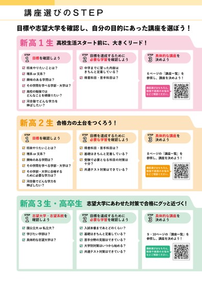 講座選びのSTEP目標や志望大学を確認し、自分の目的にあった講座を選ぼう!新高1生高校生活スタート前に、大きくリード!1STEP目標を確認しよう将来やりたいことは?理系or文系?興味のある学問は?その学問を学べる学部・大学は?高校の勉強ではどんなことを頑張りたい?河合塾でどんな学力を伸ばしたい?2STEP目標を達成するために必要な学習を確認しよう3STEP具体的な講座を決めよう中学までに習った内容はきちんと定着している?得意科目・苦手科目は?6ページの「講座一覧」を参照し、講座を決めよう!講座選びはもちろん、勉強や進路のお悩みなどご相談ください。新高2生合格力の土台をつくろう!1STEP目標を確認しよう将来やりたいことは?理系or文系?興味のある学問は?その学問を学べる学部・大学は?その学部・大学に合格するために必要な学力は?河合塾でどんな学力を伸ばしたい?2STEP目標を達成するために必要な学習を確認しよう得意科目・苦手科目は?基礎はきちんと定着している?受験で必要となる科目の対策は十分?共通テスト対策はできている?3STEP具体的な講座を決めよう8ページの「講座一覧」を参照し、講座を決めよう!講座選びはもちろん、勉強や進路のお悩みなどご相談ください。新高3生・高卒生志望大学にあわせた対策で合格にグッと近づく!1STEP志望大学・志望系統を確認しよう2STEP目標を達成するために必要な学習を確認しよう3STEP具体的な講座を決めよう国公立大or私立大?学びたい学部は?具体的な志望大学は?入試本番まであとどのくらい?基礎はきちんと定着している?苦手分野の克服はできている?大学別対策はいつから始める?共通テスト対策はできている?9・10ページの「講座一覧」を参照し、講座を決めよう!講座選びはもちろん、勉強や進路のお悩みなどご相談ください。