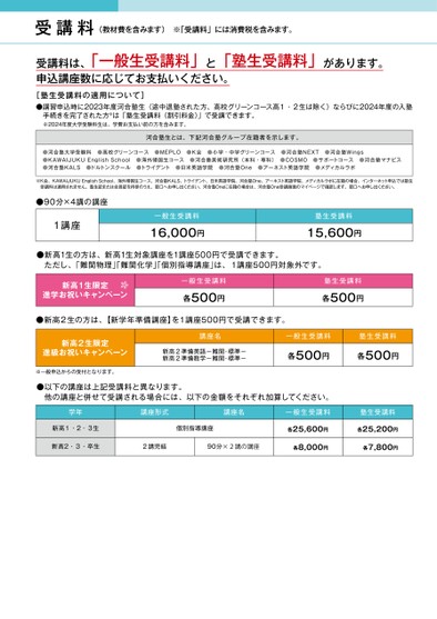 受講料(教材費を含みます)※「受講料」には消費税を含みます。受講料は、「一般生受講料」と「塾生受講料」があります。申込講座数に応じてお支払いください。[塾生受講料の適用について]●講習申込時に2023年度河合塾生(途中退塾された方、高校グリーンコース高1・2生は除く)ならびに2024年度の入塾手続きを完了された方※は「塾生受講料(割引料金)」で受講できます。※2024年度大学受験科生は、学費お支払い前の方を含みます。河合塾生とは、下記河合塾グループ在籍者を示します。●河合塾大学受験科●高校グリーンコース●MEPLO●K会●小学・中学グリーンコース●河合塾NEXT●河合塾Winɡs●KAWAIJUKUEnɡlishSchool●海外帰国生コース●河合塾美術研究所(本科・専科)●COSMO●サポートコース●河合塾マナビス●河合塾KALS●ドルトンスクール●トライデント●日米英語学院●河合塾One●アーネスト英語学院●メディカルラボ※K会、KAWAIJUKUEnɡlishSchool、海外帰国生コース、河合塾KALS、トライデント、日米英語学院、河合塾One、アーネスト英語学院、メディカルラボに在籍の場合、インターネット申込では塾生受講料は適用されません。塾生証または会員証を持参のうえ、窓口へお申し出ください。河合塾Oneに在籍の場合は、河合塾One受講画面のマイページで確認します。窓口へお申し出ください。●90分×4講の講座1講座一般生受講料16,000円塾生受講料15,600円●新高1生の方は、新高1生対象講座を1講座500円で受講できます。ただし、「難関物理」「難関化学」「個別指導講座」は、1講座500円対象外です。新高1生限定進学お祝いキャンペーン一般生受講料各500円塾生受講料各500円●新高2生の方は、【新学年準備講座】を1講座500円で受講できます。新高2生限定進級お祝いキャンペーン※一般申込からの受付となります。講座名新高2準備英語-難関・標準-新高2準備数学-難関・標準-一般生受講料各500円塾生受講料各500円●以下の講座は上記受講料と異なります。他の講座と併せて受講される場合には、以下の金額をそれぞれ加算してください。学年講座形式講座名一般生受講料塾生受講料新高1・2・3生個別指導講座新高2・3・卒生2講完結90分×2講の講座各25,600円各25,200円各8,000円各7,800円