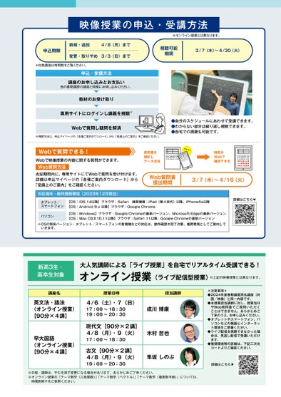 映像授業の申込・受講方法※オンライン授業とは異なります。視聴可能期間3/7(木)〜4/30(火)申込期限新規・追加4/8(月)まで変更・取りやめ3/3(日)まで*対象講座は時間割をご覧ください。申込・受講方法講座のお申し込みとお支払い他の春期講習の講座と同様にお申し込みください。教材のお受け取り専用サイトにログインし講義を視聴※Webで質問し疑問を解消※視聴方法は、申込マイページの「各種ご案内ダウンロード」から「受講上のご案内」をご確認ください。●自分のスケジュールにあわせて受講できます。●わからない部分は繰り返し視聴できます。●自宅での視聴も可能です。Webで質問できる!Webで映像授業の内容に関する質問ができます。Web質問方法質問書を撮影しデータ送信カシャ!回答がWebで確認できる右記期間内に、専用サイトにてWebで質問を受け付けます。詳細は申込マイページの「各種ご案内ダウンロード」から「受講上のご案内」をご確認ください。Web質問書提出期間対応端末・動作推奨環境(2023年12月現在)3/7(木)〜4/16(火)タブレット/スマートフォン【OS:iOS14以降】ブラウザ:Safari推奨機種:iPad(第4世代)以降、iPhone5s以降【OS:Android9.x以降】ブラウザ:GoogleChromeパソコン【OS:Windows】ブラウザ:GoogleChromeの最新バージョン、MicrosoftEdgeの最新バージョン【OS:MacOSⅩ10.11以降】ブラウザ:Safari11以降、GoogleChromeの最新バージョン※OSの将来バージョン、タブレット/スマートフォンの新機種などの対応は、動作確認が完了次第、推奨環境としてご案内していきます。詳細はこちら▼新高3生・高卒生対象大人気講師による「ライブ授業」を自宅でリアルタイム受講できる!オンライン授業(ライブ配信型授業)※上記の映像授業とは異なります。講座名授業日時担当講師英文法・語法(オンライン授業)【90分×4講】早大国語(オンライン授業)【90分×4講】4/6(土)・7(日)17:00〜18:3019:00〜20:30現代文【90分×2講】4/8(月)・9(火)17:00〜18:30古文【90分×2講】4/8(月)・9(火)19:00〜20:30成川博康木村哲也隼坂しのぶ※日程・講師は、やむを得ず変更になる場合があります。あらかじめご了承ください。※オンライン授業の「テーマ数学(三角関数)」「テーマ数学(ベクトル)」「テーマ数学(複素数平面)」については、時間割冊子をご参照ください。*注意事項*◆2024年度春期講習同名講座(対面/映像)と同一内容です。◆本授業担当講師に対し、授業当日やWeb質問書でご質問いただくことはできません。あらかじめご了承のうえ、お申し込みください。◆タブレットやスマートフォン、パソコンなどの機器とインターネット環境をご準備ください。◆ライブ配信を視聴できなかった場合は、見逃し配信で受講いただけます。◆推奨環境等の詳細は、下記二次元コードよりご確認ください。詳細はこちら▼