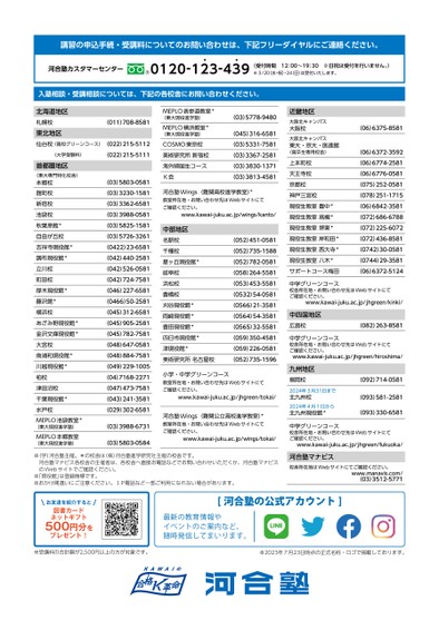 講習の申込手続・受講料についてのお問い合わせは、下記フリーダイヤルにご連絡ください。河合塾カスタマーセンター®0120-12●3-43●9(受付時間12:00〜19:30※日祝は受付を行いません。)※3/20(水・祝)・24日)は受付いたします。入塾相談・受講相談については、下記の各校舎にお問い合わせください。(011)708-8581北海道地区札幌校東北地区仙台校 (高校グリーンコース)(022)215-5112(022)215-5111 (大学受験科)首都圏地区〈東大専門特化校舎〉本郷校麹町校新宿校池袋校秋葉原館*自由が丘校 吉祥寺現役館*調布現役館*立川校町田校厚木現役館*藤沢館*横浜校あざみ野現役館*金沢文庫現役館*大宮校南浦和現役館*川越現役館*柏校津田沼校千葉現役館*水戸校MEPLO池袋教室* (東大現役進学塾)MEPLO本郷教室 (東大現役進学塾)(03)5803-0581(03)3230-1581(03)3362-6581(03)3988-0581(03)5825-1581(03)5726-3261(0422)23-6581(042)440-2581(042)526-0581(042)724-7581(046)227-6581(0466)50-2581(045)312-6581(045)905-2581(045)782-7581(048)647-0581(048)884-7581(049)229-1005(04)7168-2271(047)473-7581(043)241-3581(029)302-6581(03)3988-6731(03)5803-0584MEPLO表参道教室* (東大現役進学塾)MEPLO横浜教室* (東大現役進学塾)COSMO東京校美術研究所 新宿校海外帰国生コースK会(03)5778-9480(045)316-6581(03)5331-7581(03)3367-2581(03)3830-1371(03)3813-4581河合塾Winɡs(難関高校進学教室)*教室所在地・お問い合わせ先はWebサイトにてご確認ください。 www.kawai-juku.ac.jp/winɡs/kanto/中部地区名駅校千種校星ヶ丘現役館*岐阜校浜松校豊橋校刈谷現役館*岡崎現役館*豊田現役館*四日市現役館*津現役館*美術研究所 名古屋校(052)451-0581(052)735-1588(052)782-0581(058)264-5581(053)453-5581(0532)54-0581(0566)21-3581(0564)54-3581(0565)32-5581(059)350-4581(059)226-0581(052)735-1596小学・中学グリーンコース教室所在地・お問い合わせ先はWebサイトにてご確認ください。 www.kawai-juku.ac.jp/jhɡreen/tokai/河合塾Winɡs(難関公立高校進学教室)*教室所在地・お問い合わせ先はWebサイトにてご確認ください。 www.kawai-juku.ac.jp/winɡs/tokai/※(学)河合塾主催。*の校舎は(株)河合塾進学研究社主催の校舎です。河合塾マナビス各校舎の主催者は、各校舎へ直接お電話などでお問い合わせいただくか、河合塾マナビスのWebサイトでご確認ください。※「現役館」は登録商標です。※おかけ間違いにご注意ください。ⅠP電話など一部ご利用になれない場合があります。近畿地区大阪北キャンパス大阪校大阪北キャンパス東大・京大・医進館(高卒生専用校舎)上本町校天王寺校京都校神戸三宮校現役生教室 豊中*現役生教室 高槻*現役生教室 堺東*現役生教室 岸和田*現役生教室 西大寺*現役生教室 八木*サポートコース梅田(06)6375-8581(06)6372-3592(06)6774-2581(06)6776-0581(075)252-0581(078)251-1715(06)6842-3581(072)686-6788(072)225-6072(072)436-8581(0742)30-0581(0744)29-3581(06)6372-5124中学グリーンコース校舎所在地・お問い合わせ先はWebサイトにてご確認ください。 www.kawai-juku.ac.jp/jhɡreen/kinki/中四国地区広島校(082)263-8581中学グリーンコース校舎所在地・お問い合わせ先はWebサイトにてご確認ください。 www.kawai-juku.ac.jp/jhɡreen/hiroshima/九州地区福岡校2024年3月31日まで北九州校2024年4月1日から北九州現役館*(092)714-0581(093)581-2581(093)330-6581中学グリーンコース校舎所在地・お問い合わせ先はWebサイトにてご確認ください。 www.kawai-juku.ac.jp/jhɡreen/fukuoka/河合塾マナビス校舎所在地はWebサイトにてご確認ください。 www.manavis.com/(03)3512-5771お友達を紹介すると図書カードネットギフト500円分をプレゼント!最新の教育情報やイベントのご案内など、随時発信してまいります。※受講料の合計額が2,500円以上の方が対象です。※2023年7月23日時点の正式名称・ロゴで掲載しております。
