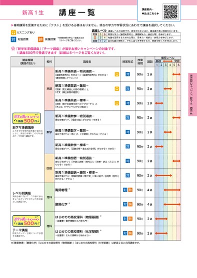 進学お祝いキャンペーン/新高1生講座一覧講座レベル基礎12発展5634「新学年準備講座」「テーマ講座」が進学お祝いキャンペーンの対象です。1講座500円で受講できます(詳細は5ページをご覧ください)。講座種類(講座の狙い)教科講座名授業形式授業時間講数1講座円500新学年準備講座これまでの学習内容を振り返るとともに、高校の学習につながる重点テーマを扱う講座です。新高1準備英語-特別選抜-「論理的思考力」を学ぶ!⇒「論理的思考力」がわかる!(難関問題にチャレンジ)英語新高1準備英語-難関-「読解(英文構造と内容の理解)」と「作文(頻出表現の確認)」新高1準備英語-標準-「読解(様々な設問形式へのアプローチ)」と「英文法(中学レベルからの確認)」新高1準備数学-特別選抜-高校で差がつく「場合の数」がわかる!できる!数学新高1準備数学-難関-高校で差がつく「数と式・2次関数」がわかる!できる!新高1準備数学-標準-高校で差がつく「因数分解・数と式の計算」がわかる!できる!国語新高1準備国語-特別選抜-高校で差がつく「評論文読解(現代文)」「語意・語法(古文)」がわかる!できる!新高1準備国語-難関・標準-高校で差がつく「評論文読解(現代文)」「係り結び・活用形(古文)」がわかる!できる!レベル別講座現役合格に向けて、この春に学力をレベルアップさせたい方を対象とした講座です。理科難関物理※難関化学※対対対対対対対対90分2講90分2講90分2講90分2講90分2講90分2講90分2講90分2講対映90分4講対映90分4講1講座円500テーマ講座特定のテーマ・分野について学習する講座です。理科はじめての高校理科(物理基礎)※-超重要!数学理解から力学入門-対映90分2講はじめての高校理科(化学基礎)※-超重要!モルの理解から始めよう-対映90分2講「難関物理」「難関化学」「はじめての高校理科(物理基礎)」「はじめての高校理科(化学基礎)」は新高2生と合同講座です。新高1生講座一覧講座案内・申込はこちら▶▶春期講習を受講するために「テスト」を受ける必要はありません。現在の学力や学習状況にあわせて講座を選択してください。リスニングあり対対面授業映映像授業*映像授業の申込・受講方法は15ページをご覧ください。基礎講座レベル講座レベルの目安です。数字が大きいほど、難易度の高い授業を行います。発展高度な学力(論理的思考力、課題解決力、論述力等)を伸ばします。知識を活用するための応用力、思考力・判断力・表現力を伸ばします。基本知識の理解と、それに基づき考察する力、問題を解く力を伸ばします。531642
