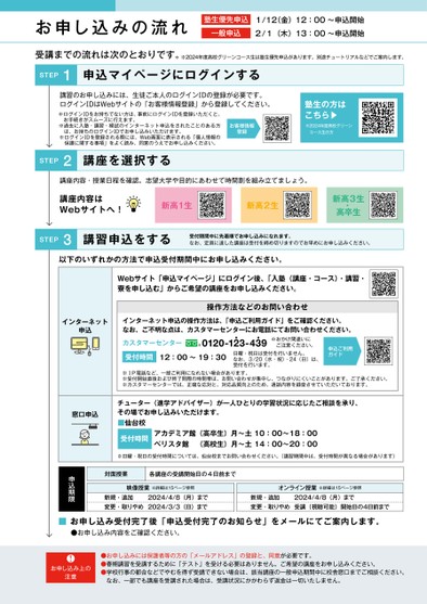 お申し込みの流れ塾生優先申込一般申込1/12(金)12:00〜申込開始2/1(木)13:00〜申込開始受講までの流れは次のとおりです。※2024年度高校グリーンコース生は塾生優先申込があります。別途チュートリアルなどでご案内します。STEP1申込マイページにログインする講習のお申し込みには、生徒ご本人のログインⅠDの登録が必要です。ログインⅠDはWebサイトの「お客様情報登録」から登録してください。※ログインⅠDをお持ちでない方は、事前にログインⅠDを登録いただくと、お手続きがスムーズに行えます。※過去に入塾・講習・模試のインターネット申込をされたことのある方お客様情報は、お持ちのログインⅠDでお申し込みいただけます。※ログインⅠDを登録される際には、Web画面に表示される「個人情報の保護に関する事項」をよく読み、同意のうえでお申し込みください。登録塾生の方はこちら▶※2024年度高校グリーンコース生の方STEP2講座を選択する講座内容・授業日程を確認。志望大学や目的にあわせて時間割を組み立てましょう。講座内容はWebサイトへ!新高1生新高2生新高3生・高卒生STEP3講習申込をする受付期間中に先着順でお申し込みになれます。なお、定員に達した講座は受付を締め切りますのでお早めにお申し込みください。以下のいずれかの方法で申込受付期間中にお申し込みください。Webサイト「申込マイページ」にログイン後、「入塾(講座・コース)・講習・寮を申し込む」からご希望の講座をお申し込みください。操作方法などのお問い合わせ※ⅠP電話など、一部ご利用になれない場合があります。※受付開始直後および終了間際の時間帯は、お問い合わせが集中し、つながりにくいことがあります。ご了承ください。※カスタマーセンターでは、正確な応対と、対応品質向上のため、通話内容を録音させていただいております。チューター(進学アドバイザー)が一人ひとりの学習状況に応じたご相談を承り、その場でお申し込みいただけます。■仙台校受付時間アカデミア館(高卒生)月〜土10:00〜18:00ベリスタ館(高校生)月〜土14:00〜20:00※日曜・祝日の受付時間については、仙台校までお問い合わせください。(講習期間中は、受付時間が異なる場合があります)対面授業各講座の受講開始日の4日前まで映像授業※詳細は15ページ参照新規・追加変更・取りやめ2024/4/8(月)まで2024/3/3(日)までオンライン授業※詳細は15ページ参照新規・追加変更・取りやめ2024/4/8(月)まで受講(視聴可能)開始日の4日前まで窓口申込申込期限■お申し込み受付完了後「申込受付完了のお知らせ」をメールにてご案内します。●お申し込み内容をご確認ください。お申し込み上の注意●お申し込みには保護者等の方の「メールアドレス」の登録と、同意が必要です。●春期講習を受講するために「テスト」を受ける必要はありません。ご希望の講座をお申し込みください。●学校行事の都合などでやむを得ず受講できない場合は、該当講座の一般申込期間中に校舎窓口までご相談ください。なお、一部でも講座を受講された場合は、受講状況にかかわらず返金は一切いたしません。インターネット申込インターネット申込の操作方法は、「申込ご利用ガイド」をご確認ください。なお、ご不明な点は、カスタマーセンターにお電話にてお問い合わせください。カスタマーセンター※おかけ間違いにご注意ください。0120-123-439・・受付時間12:00〜19:30日曜・祝日は受付を行いません。なお、3/20(水・祝)・24(日)は、受付を行います。申込ご利用ガイド