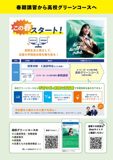 春期講習から高校グリーンコースへこの春スタート!高校生活受験勉強高校生活と両立して、志望大学現役合格を勝ち取る!学校3学期春休み1学期スタート!授業体験・入塾説明会なども実施!河合塾高校グリーンコーススタート学期(新高2・3生)3/24(日)から順次開始春期講習4/15(月)から順次開講高校グリーンコース(高校生対象)高校グリーンコースならで学習効果を最大化できる!学習の質×最適な演習量「わかったつもり」を見逃さず、学んだことをばっちり習得!自分にぴったりな学習プランと演習量で学力アップ!塾でも自宅でも講師とチューターがしっかりサポート!河合塾なら春からの入塾でも安心!講師とチューターが、今から始める一人ひとりの不安や課題に寄り添い、全力でサポートします。簡単アクセス!高校グリーンコースの●入塾説明会・体験授業●講座案内●時間割●先輩たちの合格体験記など詳しくはWebサイトへ▼高校グリーンコースログインお気に入りカート高校グリーンコース高1生・高2生・高3生高校生を第一志望大学”現役合格”へと導くコース最短ルートで現役合格を勝ち取ろう!志望大学・目的にあわせて一人ひとりにピッタリな合格戦略カリキュラムを立案。学習内容が定着する独自メソッドで学力を最大限伸ばせます。プロ講師とチューターの最強タッグで、日々の学習とやる気アップをサポート!合格まで伴走します。※画面はイメージです。一緒に頑張ろう最寄りの校舎はWebサイトでご確認ください