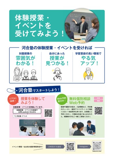 体験授業・イベントを受けてみよう!河合塾の体験授業・イベントを受ければ対面授業の雰囲気がわかる!自分にあった授業が見つかる!学習意欲の高い環境でやる気アップ!河合塾でスタートしよう!リアルに体感!授業を体験してみよう!体験授業・イベントを実施しています。体験授業・イベントの詳細やお申し込みはこちらから河合塾イベント校舎電話Web予約受付中!無料個別相談Web予約勉強や進路のお悩み、入試情報など、河合塾のチューター(進学アドバイザー)にご相談ください!校舎見学も承ります。お気軽にご予約ください。ご相談は生徒ご本人はもちろん、保護者の方もご一緒にご参加ください。イベント情報・仙台校の最新情報発信中!LINE友だち追加Instagram