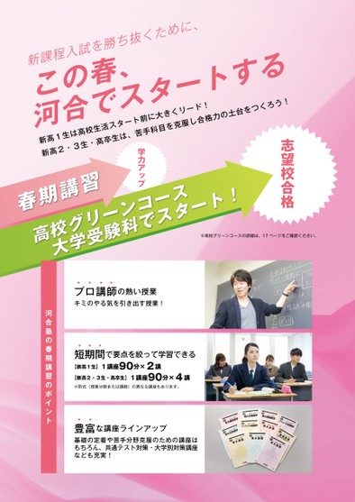 新課程入試を勝ち抜くために、この春、河合でスタートするに科きを大目く克!格リ服ーしド合前手力土のを台ろくつ!うト苦ー、タはス生校・高生は3生・活卒生高高高新新12春期講習高校グリーンコース大学受験科でスタート!※高校グリーンコースの詳細は、17ページをご確認ください。プロ講師の熱い授業キミのやる気を引き出す授業!短期間で要点を絞って学習できる【新高1生】1講座90分×2講【新高2・3生・高卒生】1講座90分×4講※形式(授業分数または講数)の異なる講座もあります。豊富な講座ラインアップ基礎の定着や苦手分野克服のための講座はもちろん、共通テスト対策・大学別対策講座なども充実!河合塾の春期講習のポイント