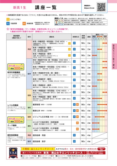進学お祝いキャンペーン/新高1生講座一覧講座レベル基礎12発展5634「新学年準備講座」「テーマ講座」が進学お祝いキャンペーンの対象です。1講座500円で受講できます(詳細は5ページをご覧ください)。講座種類(講座の狙い)1講座円500新学年準備講座これまでの学習内容を振り返るとともに、高校の学習につながる重点テーマを扱う講座です。教科英語講座名新高1準備英語-特別選抜(ONEWEX)-「論理的思考力」を学ぶ!⇒「論理的思考力」がわかる!(難関問題にチャレンジ)新高1準備英語-難関-「読解(英文構造と内容の理解)」と「作文(頻出表現の確認)」新高1準備英語-標準-「読解(様々な設問形式へのアプローチ)」と「英文法(中学レベルからの確認)」新高1準備数学中高一貫-特別選抜(ONEWEX)-高い到達目標を見据えて、高校数学の「本質」を理解する速習カリキュラム対応講座授業形式授業時間講数対映90分2講対映90分2講対映90分2講対映90分2講新高1準備数学-特別選抜(ONEWEX)-高校で差がつく「場合の数」がわかる!できる!対映90分2講数学新高1準備数学中高一貫-難関-高校で差がつく「2次関数・図形と計量」がわかる!できる!対映90分2講新高1準備数学-難関-高校で差がつく「数と式・2次関数」がわかる!できる!対映90分2講新高1準備数学-標準-高校で差がつく「因数分解・数と式の計算」がわかる!できる!対映90分2講国語理科レベル別講座現役合格に向けて、この春に学力をレベルアップさせたい方を対象とした講座です。新高1準備国語-特別選抜(ONEWEX)-高校で差がつく「評論文読解(現代文)」「語意・語法(古文)」がわかる!できる!新高1準備国語-難関・標準-高校で差がつく「評論文読解(現代文)」「係り結び・活用形(古文)」がわかる!できる!難関物理(新高1・2生共通)難関化学(新高1・2生共通)対映90分2講対映90分2講対映90分4講対映90分4講国語ビジュアル古文常識(新高1・2・3生・高卒生共通)対映90分2講1講座円500テーマ講座特定のテーマ・分野について学習する講座です。理科はじめての高校理科(物理基礎)-超重要!数学理解から力学入門-(新高1・2生共通)はじめての高校理科(化学基礎)-超重要!モルの理解から始めよう-(新高1・2生共通)個別指導講座学習プランナー(河合塾講師)との学習カウンセリングで決定した内容を、個別指導員が丁寧に指導します。英語個別指導英語数学個別指導数学対映90分2講対映90分2講対映90分4講対映90分4講千種校高1エンリッチコース超トップレベル生専用東海・南山女子エンリッチコースめざすのは東大・京大・医学部医学科への現役合格設置東海・南山女子生のための速習カリキュラム(定員制)千種校のみ◆高1エンリッチ英語◆高1エンリッチ数学◆高1エンリッチ物理〈物理は定員に達したため締切〉*受講には認定(受講資格)が必要です。*春期講習の詳細は、別チラシ2024年度春期講習『東海・南山女子エンリッチコース』をご覧ください。新高1生講座一覧講座案内・申込はこちら▶▶春期講習を受講するために「テスト」を受ける必要はありません。現在の学力や学習状況にあわせて講座を選択してください。リスニングあり対対面授業映映像授業*映像授業の申込・受講方法は時間割冊子をご覧ください。基礎講座レベル講座レベルの目安です。数字が大きいほど、難易度の高い授業を行います。発展高度な学力(論理的思考力、課題解決力、論述力等)を伸ばします。知識を活用するための応用力、思考力・判断力・表現力を伸ばします。基本知識の理解と、それに基づき考察する力、問題を解く力を伸ばします。531642