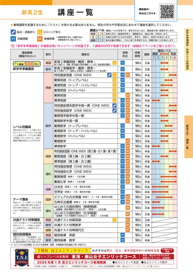 新学年準備講座/共通テスト対策講座新高2生講座一覧新高2生講座一覧講座案内・申込はこちら▶▶春期講習を受講するために「テスト」を受ける必要はありません。現在の学力や学習状況にあわせて講座を選択してください。採点・添削ありリスニングあり対対面授業映映像授業*映像授業の申込・受講方法は時間割冊子をご覧ください。基礎講座レベル講座レベルの目安です。数字が大きいほど、難易度の高い授業を行います。発展高度な学力(論理的思考力、課題解決力、論述力等)を伸ばします。知識を活用するための応用力、思考力・判断力・表現力を伸ばします。基本知識の理解と、それに基づき考察する力、問題を解く力を伸ばします。531642「新学年準備講座」が進級お祝いキャンペーンの対象です。1講座500円で受講できます(詳細は7ページをご覧ください)。講座レベル基礎12発展5634講座種類(講座のねらい)1講座円500新学年準備講座レベル別講座現役合格に向けて、この春に学力をレベルアップさせたい方を対象とした講座です。レベル別に講座が設置されていますので、自身に最適の講座を選ぶことができます。テーマ講座特定のテーマ・分野について学習します。得意分野の更なる強化や苦手分野の克服など、自身の目的に応じて講座を選ぶことができます。共通テスト対策講座大学入学共通テストでの高得点獲得をめざして、この春から共通テスト対策を行い、準備を万全にします。個別指導講座学習プランナー(河合塾講師)との学習カウンセリングで決定した内容を、個別指導員が丁寧に指導します。教科英語数学英語数学国語理科地歴国語理科英語数学国語英語数学講座名新高2準備英語-難関・標準-高2で差がつく「読解(英文構造と内容の理解)」と「作文(頻出表現の確認)」新高2準備数学-難関・標準-高2で差がつく「図形と方程式」の重要ポイントを伝授!特別選抜英語(ONEWEX)難関英語(トップレベル)難関英語(トップ・ハイレベル)難関英語(ハイレベル)難関英語標準英語特別選抜理系数学中高一貫(ONEWEX)特別選抜数学(ONEWEX)難関理系数学中高一貫難関数学中高一貫難関数学(トップレベル)難関数学(トップ・ハイレベル)難関数学(ハイレベル)難関数学標準数学特別選抜国語(ONEWEX)[現2講・古1講・漢1講]難関国語[現2講・古2講]標準国語[現2講・古2講]特別選抜物理(ONEWEX)特別選抜化学(ONEWEX)難関物理(新高1・2生共通)難関化学(新高1・2生共通)日本史(新高2・3生・高卒生共通)世界史(新高2・3生・高卒生共通)ビジュアル古文常識(新高1・2・3生・高卒生共通)古典文法基礎(新高2・3生・高卒生共通)はじめての高校理科(物理基礎)-超重要!数学理解から力学入門-(新高1・2生共通)はじめての高校理科(化学基礎)-超重要!モルの理解から始めよう-(新高1・2生共通)共通テスト対策英語共通テスト対策数学共通テスト対策現代文個別指導英語個別指導数学授業形式対映対映対映対映対映対映対映対映対映対映対映対映対映対映対映対映対映対映対映対映対映対映対映対映対映対映対映対映対映対映対映対映対映対映対映授業時間90分90分90分90分90分90分90分90分90分90分90分90分90分90分90分90分90分90分90分90分90分90分90分90分90分90分90分90分90分90分90分90分90分90分90分講数2講2講4講4講4講4講4講4講4講4講4講4講4講4講4講4講4講4講4講4講4講4講4講4講4講4講2講4講2講2講2講2講2講4講4講※「ビジュアル古文常識」は2023年度春期・夏期・冬期講習の同名講座と同一内容です。千種校高2エンリッチコース超トップレベル生専用東海・南山女子エンリッチコース2024年度1月高2エンリッチコース新規開講◆高2エンリッチ英語◆高2エンリッチ数学めざすのは東大・京大・医学部医学科への現役合格設置東海・南山女子生のための速習カリキュラム(定員制)千種校のみ*受講には認定(受講資格)が必要です。*春期講習の詳細は、別チラシ2024年度春期講習『東海・南山女子エンリッチコース』をご覧ください。