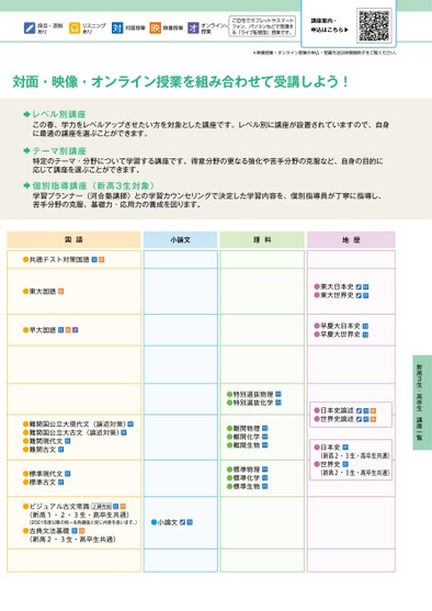 新高3生・高卒生講座一覧対対●東大日本史●東大世界史●早慶大日本史対●早慶大世界史対●日本史論述●世界史論述対対映映●日本史●世界史対対(新高2・3生・高卒生共通)(新高2・3生・高卒生共通)対対●特別選抜物理●特別選抜化学対対対●難関物理●難関化学●難関生物対対対●標準物理●標準化学●標準生物●小論文対●共通テスト対策国語対映●東大国語映●早大国語対映オ●難関国公立大現代文(論述対策)●難関国公立大古文(論述対策)●難関現代文●難関古文対対対対●標準現代文●標準古文対対対映2講完結●ビジュアル古文常識(新高1・2・3生・高卒生共通)●古典文法基礎(新高2・3生・高卒生共通)(2021年度以降の同一名称講座と同じ内容を扱います。)映対対面・映像・オンライン授業を組み合わせて受講しよう!採点・添削ありリスニングあり対対面授業映映像授業オオンライン授業ご自宅でタブレットやスマートフォン、パソコンなどで受講する「ライブ配信型」授業です。講座案内・申込はこちら▶*映像授業・オンライン授業の申込・受講方法は時間割冊子をご覧ください。レベル別講座この春、学力をレベルアップさせたい方を対象とした講座です。レベル別に講座が設置されていますので、自身に最適の講座を選ぶことができます。テーマ別講座特定のテーマ・分野について学習する講座です。得意分野の更なる強化や苦手分野の克服など、自身の目的に応じて講座を選ぶことができます。個別指導講座(新高3生対象)学習プランナー(河合塾講師)との学習カウンセリングで決定した学習内容を、個別指導員が丁寧に指導し、苦手分野の克服、基礎力・応用力の養成を図ります。国語小論文理科地歴
