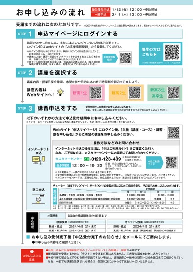 お申し込みの流れ塾生優先申込一般申込1/12(金)12:00〜申込開始2/1(木)13:00〜申込開始受講までの流れは次のとおりです。※2024年度高校グリーンコース生は塾生優先申込があります。別途チュートリアルなどでご案内します。STEP1申込マイページにログインする講習のお申し込みには、生徒ご本人のログインⅠDの登録が必要です。ログインⅠDはWebサイトの「お客様情報登録」から登録してください。※ログインⅠDをお持ちでない方は、事前にログインⅠDを登録いただくと、お手続きがスムーズに行えます。※過去に入塾・講習・模試のインターネット申込をされたことのある方は、お持ちのログインⅠDでお申し込みいただけます。※ログインⅠDを登録される際には、Web画面に表示される「個人情報の保護に関する事項」をよく読み、同意のうえでお申し込みください。お客様情報登録塾生の方はこちら▶※2024年度高校グリーンコース生の方STEP2講座を選択する講座内容・授業日程を確認。志望大学や目的にあわせて時間割を組み立てましょう。講座内容はWebサイトへ!新高1生新高2生新高3生・高卒生STEP3講習申込をする受付期間中に先着順でお申し込みになれます。なお、定員に達した講座は受付を締め切りますのでお早めにお申し込みください。以下のいずれかの方法で申込受付期間中にお申し込みください。※インターネットではお申し込みになれない講座があります。下記「お申し込み上の注意」をご覧ください。Webサイト「申込マイページ」にログイン後、「入塾(講座・コース)・講習・寮を申し込む」からご希望の講座をお申し込みください。操作方法などのお問い合わせ※ⅠP電話など、一部ご利用になれない場合があります。※受付開始直後および終了間際の時間帯は、お問い合わせが集中し、つながりにくいことがあります。ご了承ください。※カスタマーセンターでは、正確な応対と、対応品質向上のため、通話内容を録音させていただいております。チューター(進学アドバイザー)が一人ひとりの学習状況に応じたご相談を承り、その場でお申し込みいただけます。受付時間火〜土月11:00〜19:0014:00〜20:00休館日14:00〜20:00日祝10:00〜17:00※1※2休館日13:00〜18:00名駅校・千種校・岐阜校・浜松校・豊橋校星ヶ丘現役館・刈谷現役館・岡崎現役館・豊田現役館・津現役館四日市現役館受付時間※1:2/11(日・祝)は休館日、2/12(月・振)・2/23(金・祝)・3/20(水・祝)は14:00〜20:00で受付を行います。※2:2/12(月・振)は休館日、2/11(日・祝)は13:00〜18:00、2/23(金・祝)・3/20(水・祝)は14:00〜20:00で受付を行います。対面授業各講座の受講開始日の4日前まで映像授業※詳細は時間割冊子参照新規・追加変更・取りやめ2024/4/8(月)まで2024/3/3(日)までオンライン授業※詳細は時間割冊子参照新規・追加変更・取りやめ2024/4/8(月)まで受講(視聴可能)開始日の4日前まで窓口申込申込期限■お申し込み受付完了後「申込受付完了のお知らせ」をメールにてご案内します。●お申し込み内容をご確認ください。お申し込み上の注意●お申し込みには保護者等の方の「メールアドレス」の登録と、同意が必要です。●春期講習を受講するために「テスト」を受ける必要はありません。ご希望の講座をお申し込みください。●学校行事の都合などでやむを得ず受講できない場合は、該当講座の一般申込期間中に校舎窓口までご相談ください。なお、一部でも講座を受講された場合は、受講状況にかかわらず返金は一切いたしません。インターネット申込インターネット申込の操作方法は、「申込ご利用ガイド」をご確認ください。なお、ご不明な点は、カスタマーセンターにお電話にてお問い合わせください。カスタマーセンター※おかけ間違いにご注意ください。0120-123-439・・受付時間12:00〜19:30日曜・祝日は受付を行いません。ただし、3/20(水・祝)・24(日)は、受付を行います。申込ご利用ガイド